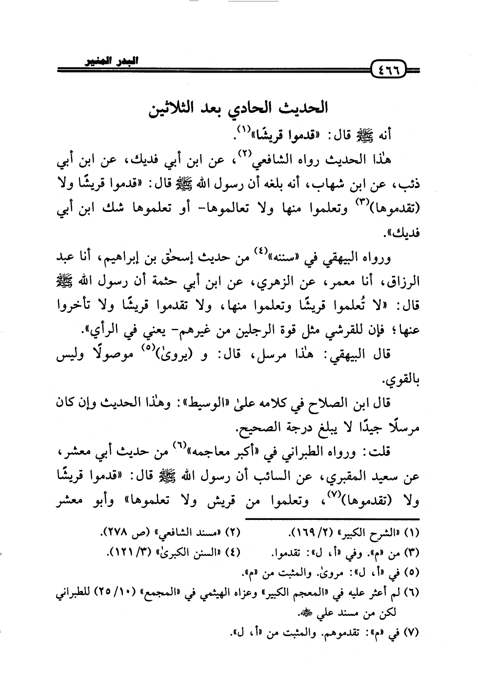 هَذَا الحَدِيث رَوَاهُ الشَّافِعِي، عَن ابْن أبي فديك، عَن ابْن أبي ذِئْب، عَن ابْن شهَاب، أَنه بلغه أَن رَسُول الله - صَلَّى الله عَلَيْهِ وَسلم - قَالَ: «قدمُوا قُريْشًا وَلَا (تقدموها) وتعلموا مِنْهَا وَلَا تعالموها - أَو تعلموها شكّ ابْن أبي فديك» .