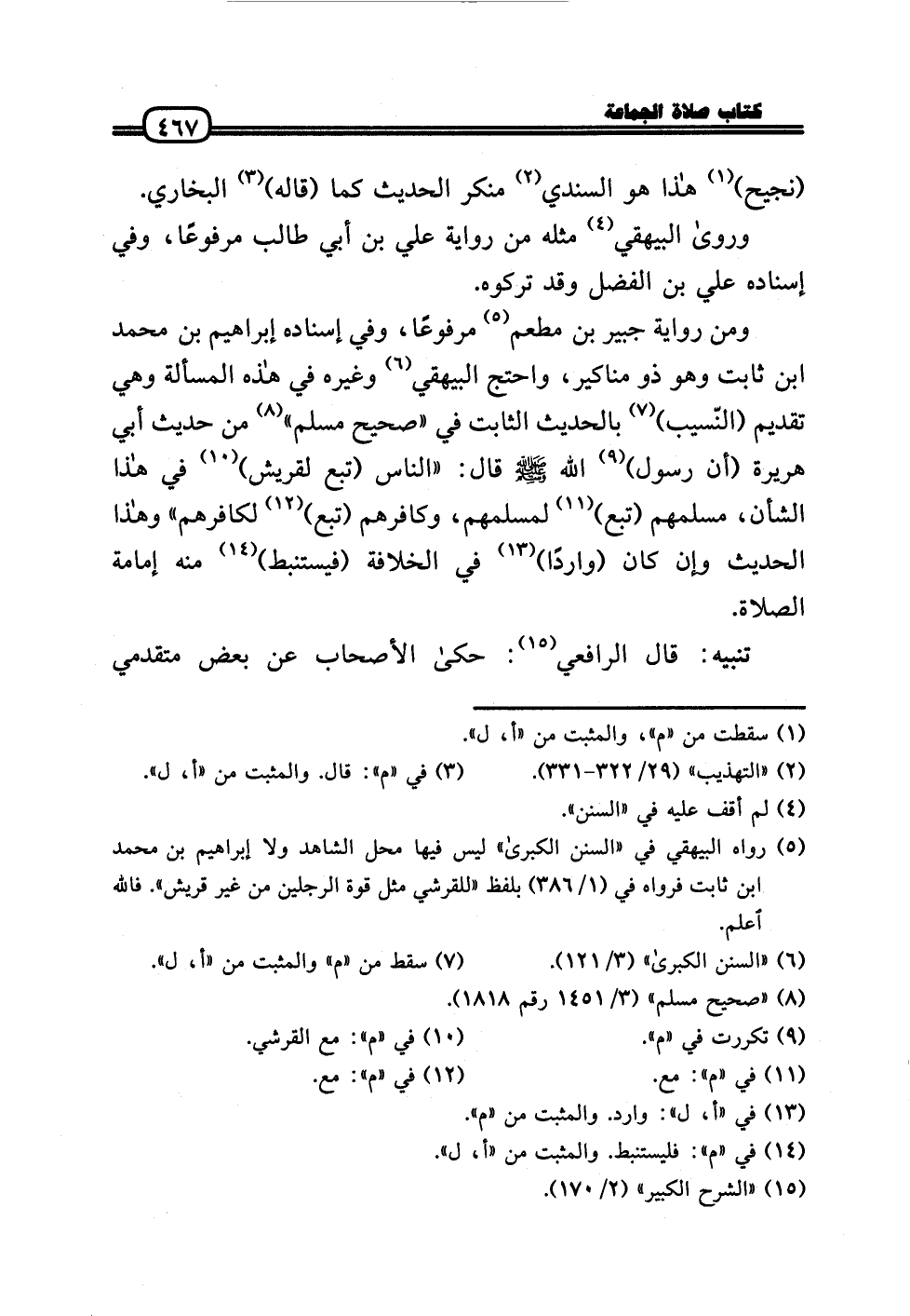 وَمن رِوَايَة جُبَير بن مطعم مَرْفُوعا، وَفِي إِسْنَاده إِبْرَاهِيم بن مُحَمَّد بن ثَابت وَهُوَ ذُو مَنَاكِير، وَاحْتج الْبَيْهَقِيّ وَغَيره فِي هَذِه الْمَسْأَلَة وَهِي تَقْدِيم (النّسيب) بِالْحَدِيثِ الثَّابِت فِي «صَحِيح مُسلم» من حَدِيث أبي هُرَيْرَة (أَن رَسُول) الله (قَالَ: «النَّاس (تبع لقريش) فِي هَذَا الشَّأْن، مسلمهم (تبع) لمسلمهم، وكافرهم (تبع) لكافرهم» وَهَذَا الحَدِيث وَإِن كَانَ (واردًا) فِي الْخلَافَة (فيستنبط) مِنْهُ إِمَامَة الصَّلَاة.