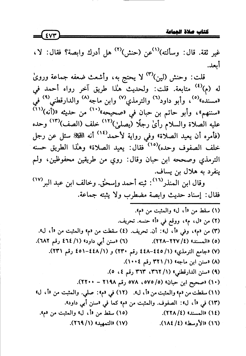 قلت: وحنش (لين) لَا يحْتَج بِهِ، وَأَشْعَث ضعفه جمَاعَة وَرَوَى لَهُ (م) مُتَابعَة. قلت: وَلِحَدِيث هَذَا طَرِيق آخر رَوَاهُ أَحْمد فِي «مُسْنده» ، وَأَبُو دَاوُد وَالتِّرْمِذِيّ وَابْن مَاجَه وَالدَّارَقُطْنِيّ فِي «سُنَنهمْ» ، وَأَبُو حَاتِم بن حبَان فِي «صَحِيحه» من حَدِيثه « (أَنه) عَلَيْهِ الصَّلَاة وَالسَّلَامُ رَأَى رجلا (يصلى) خلف (الصَّفّ) وَحده (فَأمره أَن يُعِيد الصَّلَاة» وَفِي رِوَايَة لِأَحْمَد أَنه عَلَيْهِ السَّلَام سُئِلَ عَن رجل خلف الصُّفُوف وَحده) فَقَالَ: يُعِيد الصَّلَاة» وَهَذَا الطَّرِيق حسنه التِّرْمِذِيّ وَصَححهُ ابْن حبَان وَقَالَ: رُوِيَ من طَرِيقين محفوظين، وَلم ينْفَرد بِهِ هِلَال بن يسَاف.