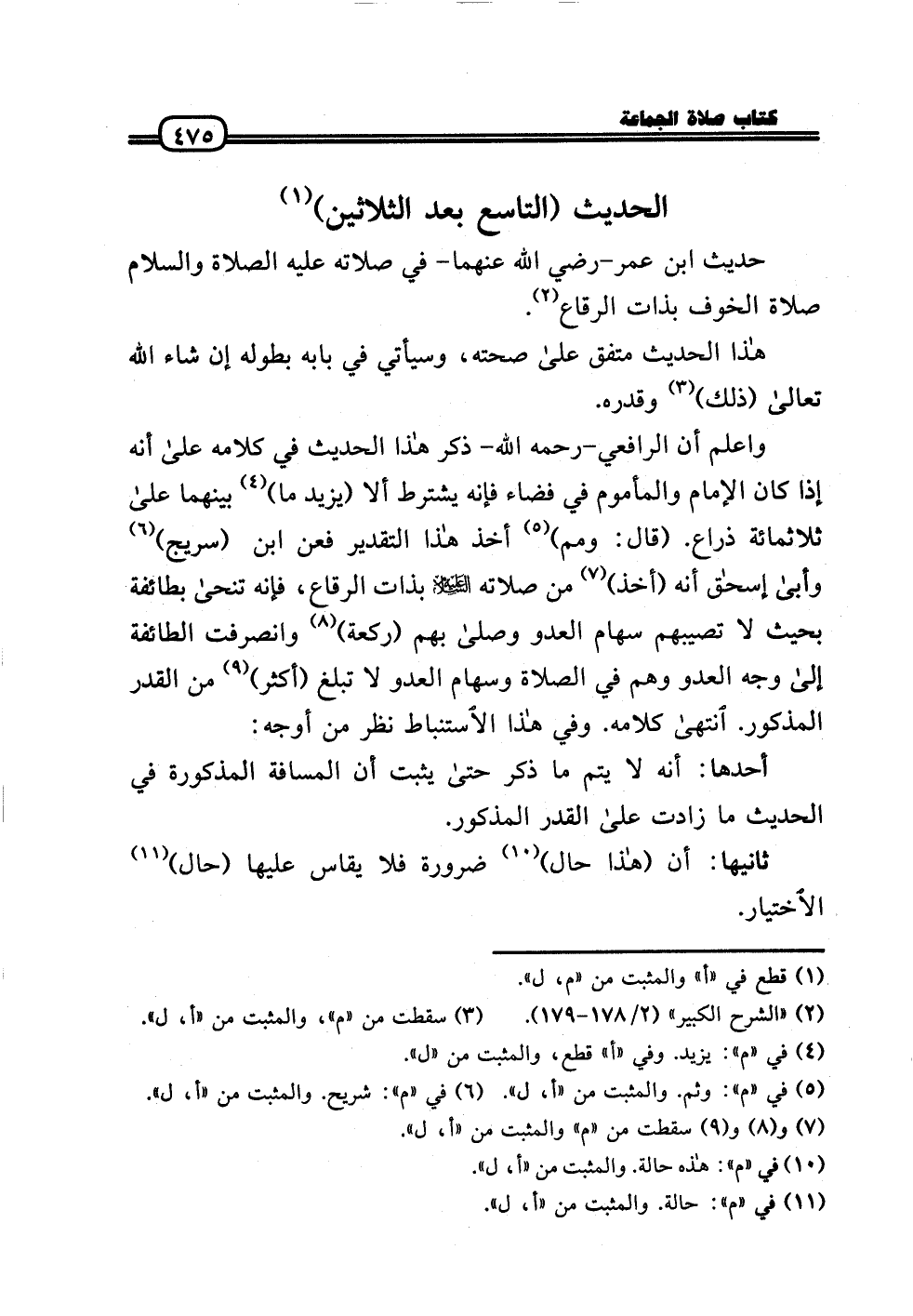 وَاعْلَم أَن الرَّافِعِيّ - رَحِمَهُ اللَّهُ - ذكر هَذَا الحَدِيث فِي كَلَامه عَلَى أَنه إِذا كَانَ الإِمَام وَالْمَأْمُوم فِي فضاء فَإِنَّهُ يشْتَرط أَلا (يزِيد مَا) بَينهمَا عَلَى ثَلَاثمِائَة ذِرَاع. (قَالَ: ومم) أَخذ هَذَا التَّقْدِير فَعَن ابْن (سُرَيج) وَأَبَى إِسْحَاق أَنه (أَخذ) من صلَاته عَلَيْهِ السَّلَام بِذَات الرّقاع، فَإِنَّهُ تنحى بطَائفَة بِحَيْثُ لَا تصيبهم سِهَام الْعَدو وَصَلى بهم (رَكْعَة) وانصرفت الطَّائِفَة إِلَى وَجه الْعَدو وهم فِي الصَّلَاة وسهام الْعَدو لَا تبلغ (أَكثر) من الْقدر الْمَذْكُور. انْتَهَى كَلَامه. وَفِي هَذَا الاستنباط نظر من أوجه: