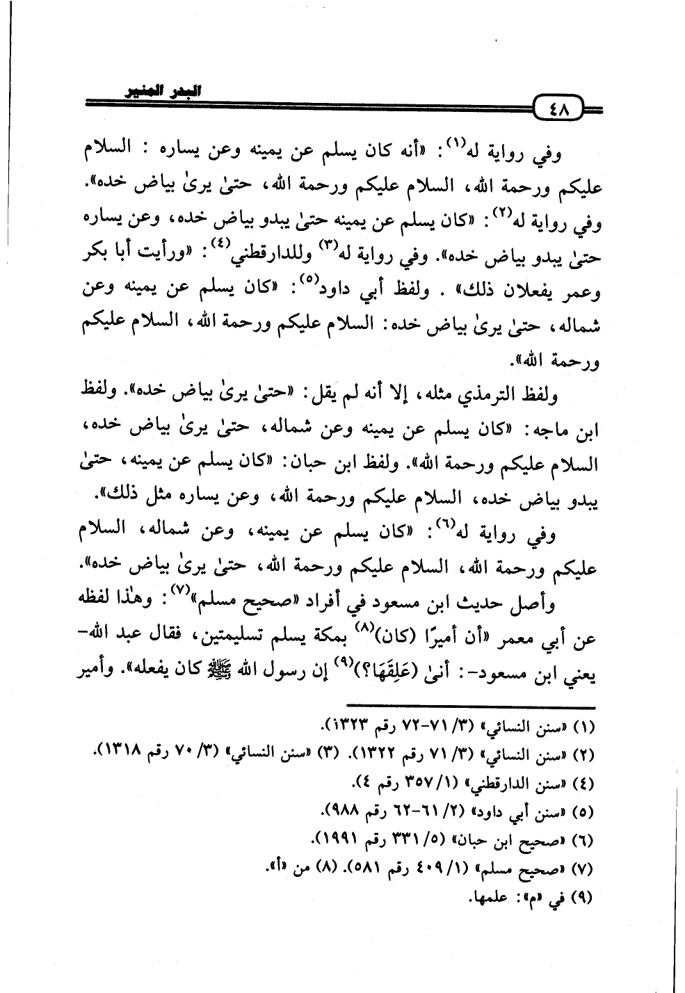 وَلَفظ التِّرْمِذِيّ مثله، إِلَّا أَنه لم يقل: «حَتَّى يرَى بَيَاض خَدّه» . وَلَفظ ابْن مَاجَه: «كَانَ يسلم عَن يَمِينه وَعَن شِمَاله، حَتَّى يرَى بَيَاض خَدّه، السَّلَام عَلَيْكُم وَرَحْمَة الله» . وَلَفظ ابْن حبَان: «كَانَ يسلم عَن يَمِينه، حَتَّى يَبْدُو بَيَاض خَدّه، السَّلَام عَلَيْكُم وَرَحْمَة الله، وَعَن يسَاره مثل ذَلِك» .