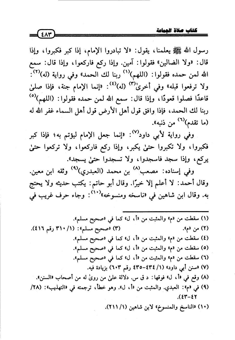 رَسُول الله - صَلَّى الله عَلَيْهِ وَسلم - يعلمنَا، يَقُول: «لَا تبَادرُوا الإِمَام، إِذا كبر فكبروا، وَإِذا قَالَ: «وَلَا الضَّالّين» فَقولُوا: آمين. وَإِذا ركع فاركعوا، وَإِذا قَالَ: سمع الله لمن حَمده فَقولُوا: (اللَّهُمَّ) رَبنَا لَك الْحَمد» وَفِي رِوَايَة (لَهُ) : وَلَا تَرفعُوا قبله» وَفِي أُخْرَى (لَهُ) : «إِنَّمَا الإِمَام جنَّة، فَإِذا صَلَّى قَاعِدا فصلوا قعُودا، وَإِذا قَالَ: سمع الله لمن حَمده فَقولُوا: (اللَّهُمَّ) رَبنَا لَك الْحَمد، فَإِذا وَافق قَول أهل الأَرْض قَول أهل السَّمَاء غفر الله لَهُ (مَا تقدم) من ذَنبه» .