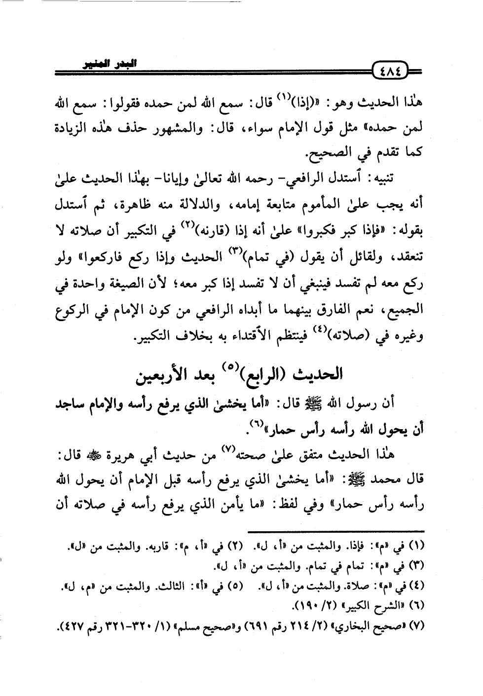 تَنْبِيه: اسْتدلَّ الرَّافِعِيّ - رَحِمَهُ اللَّهُ تَعَالَى وإيانا - بِهَذَا الحَدِيث عَلَى أَنه يجب عَلَى الْمَأْمُوم مُتَابعَة إِمَامه، وَالدّلَالَة مِنْهُ ظَاهِرَة، ثمَّ اسْتدلَّ بقوله: «فَإِذا كبر فكبروا» عَلَى أَنه إِذا (قارنه) فِي التَّكْبِير أَن صلَاته لَا تَنْعَقِد، وَلقَائِل أَن يَقُول (فِي تَمام) الحَدِيث وَإِذا ركع فاركعوا» وَلَو ركع مَعَه لم تفْسد فَيَنْبَغِي أَن لَا تفْسد إِذا كبر مَعَه؛ لِأَن الصِّيغَة وَاحِدَة فِي الْجَمِيع، نعم الْفَارِق بَينهمَا مَا أبداه الرَّافِعِيّ من كَون الإِمَام فِي الرُّكُوع وَغَيره فِي (صلَاته) فينتظم الِاقْتِدَاء بِهِ بِخِلَاف التَّكْبِير.