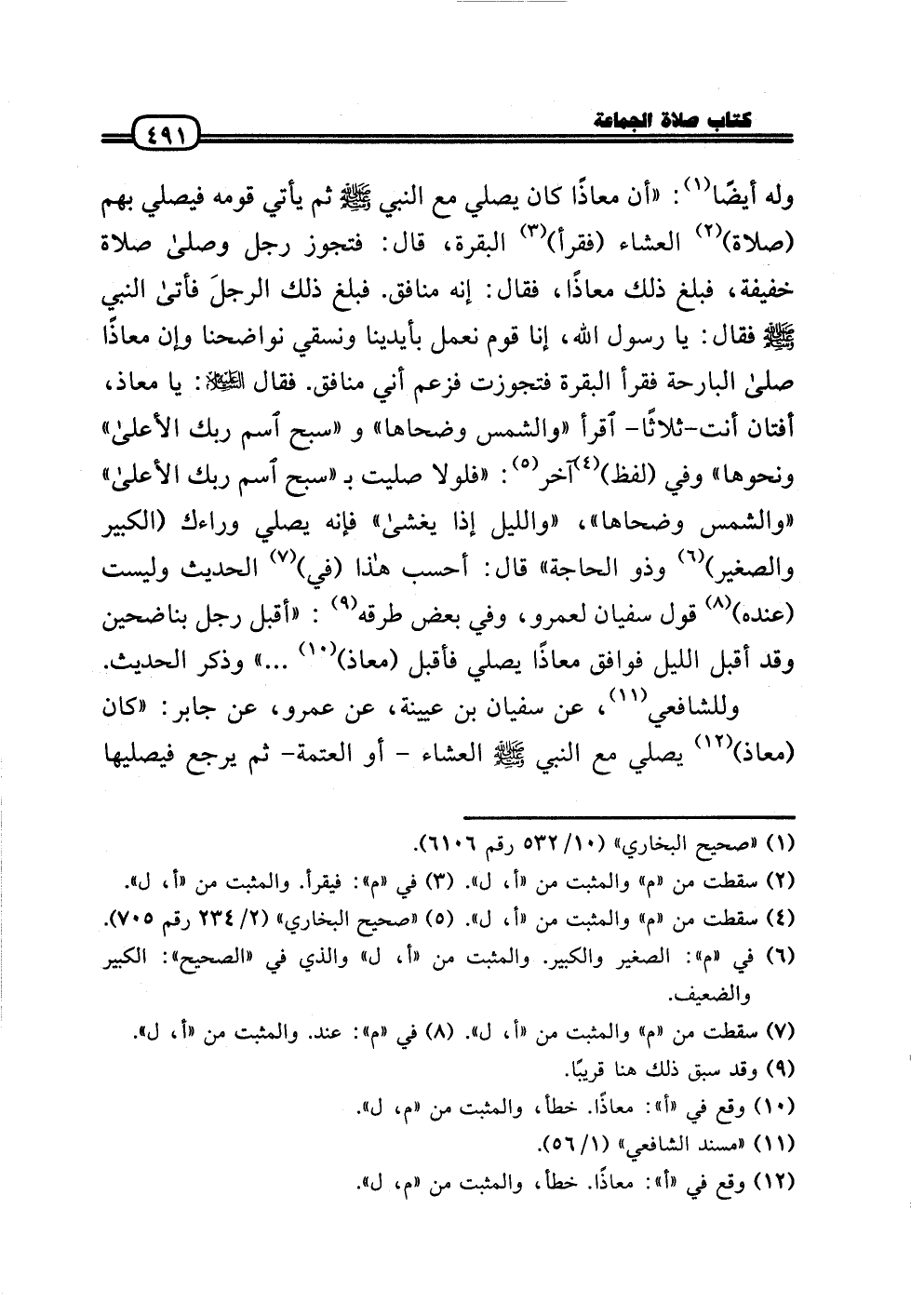 وَله أَيْضا: «أَن معَاذًا كَانَ يُصَلِّي مَعَ النَّبِي - صَلَّى الله عَلَيْهِ وَسلم - ثمَّ يَأْتِي قومه فَيصَلي بهم (صَلَاة) الْعشَاء (فَقَرَأَ) الْبَقَرَة، قَالَ: فَتجوز رجل وَصَلى صَلَاة خَفِيفَة، فَبلغ ذَلِك معَاذًا، فَقَالَ: إِنَّه مُنَافِق. فَبلغ ذَلِك الرجلَ فَأَتَى النَّبِي - صَلَّى الله عَلَيْهِ وَسلم - فَقَالَ: يَا رَسُول الله، إِنَّا قوم نعمل بِأَيْدِينَا ونسقي نواضحنا وَإِن معَاذًا صَلَّى البارحة فَقَرَأَ الْبَقَرَة فتجوزت فَزعم أَنِّي مُنَافِق. فَقَالَ عَلَيْهِ السَّلَام: يَا معَاذ، أفتان أَنْت - ثَلَاثًا - اقْرَأ (وَالشَّمْس وَضُحَاهَا) و (سبح اسْم رَبك الْأَعْلَى) وَنَحْوهَا» وَفِي (لفظ) آخر: «فلولا صليت ب (سبح اسْم رَبك الْأَعْلَى) (وَالشَّمْس وَضُحَاهَا) ، (وَاللَّيْل إِذا يغشى) فَإِنَّهُ يُصَلِّي وَرَاءَك (الْكَبِير وَالصَّغِير) وَذُو الْحَاجة» قَالَ: أَحسب هَذَا (فِي) الحَدِيث وَلَيْسَت (عِنْده) قَول سُفْيَان لعَمْرو، وَفِي بعض طرقه: «أقبل رجل بناضحين وَقد أقبل اللَّيْل فَوَافَقَ معَاذًا يُصَلِّي فَأقبل (معَاذ)