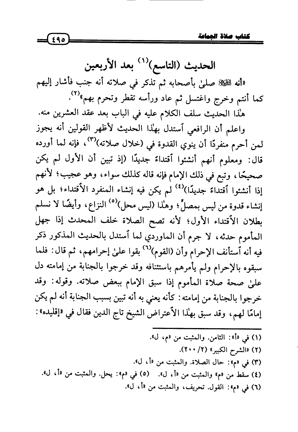 وَاعْلَم أَن الرَّافِعِيّ اسْتدلَّ بِهَذَا الحَدِيث لأظهر الْقَوْلَيْنِ أَنه يجوز لمن أحرم مُنْفَردا أَن يَنْوِي الْقدْوَة فِي (خلال صلَاته) ، فَإِنَّهُ لما أوردهُ قَالَ: وَمَعْلُوم أَنهم أنشئوا اقْتِدَاء جَدِيدا (إِذْ تبين أَن الأول لم يكن صَحِيحا، وَتبع فِي ذَلِك الإِمَام فَإِنَّهُ قَالَه كَذَلِك سَوَاء، وَهُوَ عَجِيب؛ لأَنهم إِذا أنشئوا اقْتِدَاء جَدِيدا) لم يكن فِيهِ إنْشَاء الْمُنْفَرد الِاقْتِدَاء؛ بل هُوَ إنْشَاء قدوة من لَيْسَ بمصلٍّ؛ وَهَذَا (لَيْسَ مَحل) النزاع، وَأَيْضًا لَا نسلم بطلَان الِاقْتِدَاء الأول؛ لِأَنَّهُ تصح الصَّلَاة خلف الْمُحدث إِذا جهل الْمَأْمُوم حَدثهُ، لَا جرم أَن الْمَاوَرْدِيّ لما اسْتدلَّ بِالْحَدِيثِ الْمَذْكُور ذكر فِيهِ أَنه اسْتَأْنف الْإِحْرَام وَأَن (الْقَوْم) بقوا عَلَى إحرامهم، ثمَّ قَالَ: فَلَمَّا سَبَقُوهُ بِالْإِحْرَامِ وَلم يَأْمُرهُم باستئنافه وَقد خَرجُوا بالجنابة من إِمَامَته دلّ عَلَى صِحَة صَلَاة الْمَأْمُوم إِذا سبق الإِمَام بِبَعْض صلَاته. وَقَوله: وَقد خَرجُوا بالجنابة من إِمَامَته: كَأَنَّهُ يَعْنِي بِهِ أَنه تبين بِسَبَب الْجَنَابَة أَنه لم يكن إِمَامًا لَهُم، وَقد سبق بِهَذَا الِاعْتِرَاض الشَّيْخ تَاج الدَّين فَقَالَ فِي «إقليده» :