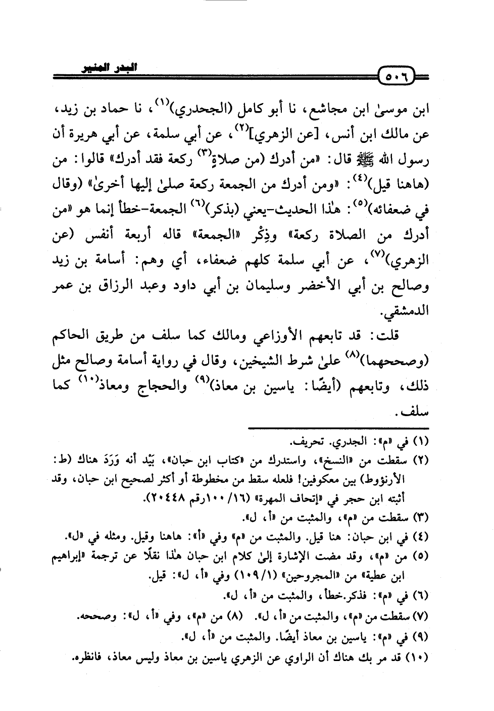 بن مُوسَى بن مجاشع، نَا أَبُو كَامِل (الجحدري) ، نَا حَمَّاد بن زيد، عَن مَالك بن أنس، [عَن الزُّهْرِيّ] ، عَن أبي سَلمَة، عَن أبي هُرَيْرَة أَن رَسُول الله - صَلَّى الله عَلَيْهِ وَسلم - قَالَ: «من أدْرك (من صلاةٍ رَكْعَة فقد أدْرك» قَالُوا: من (هَاهُنَا قيل) : «وَمن أدْرك من الْجُمُعَة رَكْعَة صَلَّى إِلَيْهَا أُخْرَى» (وَقَالَ فِي ضُعَفَائِهِ) : هَذَا الحَدِيث - يَعْنِي (بِذكر) الْجُمُعَة - خطأ إِنَّمَا هُوَ «من أدْرك من الصَّلَاة رَكْعَة» وذِكْر «الْجُمُعَة» قَالَه أَرْبَعَة أنفس (عَن الزُّهْرِيّ) ، عَن أبي سَلمَة كلهم ضعفاء، أَي وهم: أُسَامَة بن زيد وَصَالح بن أبي الْأَخْضَر وَسليمَان بن أبي دَاوُد وَعبد الرَّزَّاق بن عمر الدِّمَشْقِي.