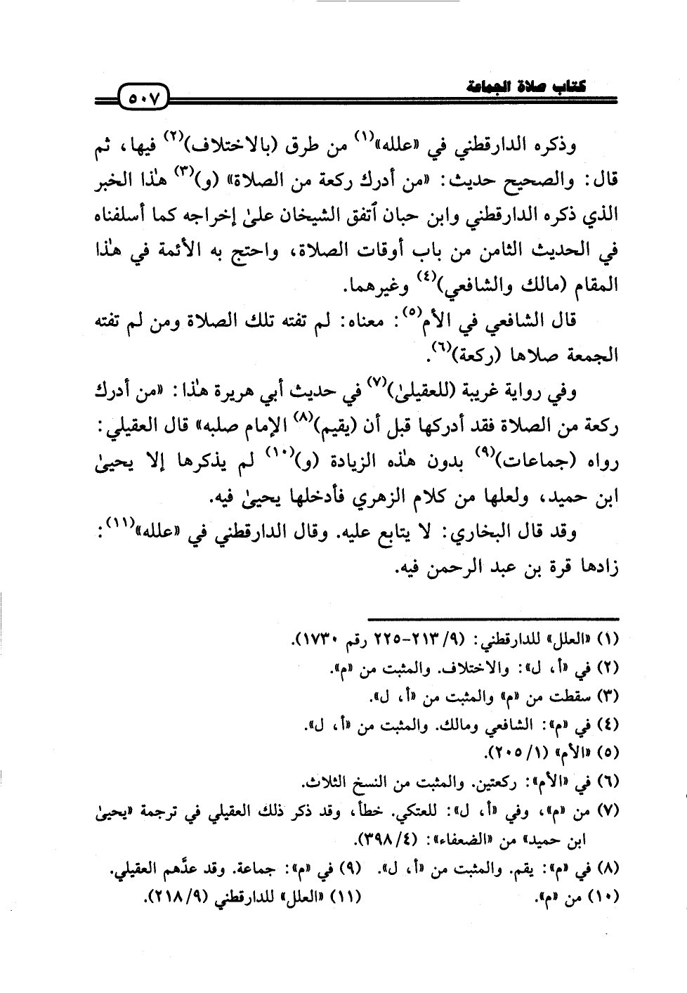 وَذكره الدَّارَقُطْنِيّ فِي «علله» من طرق (بالاختلاف) فِيهَا، ثمَّ قَالَ: وَالصَّحِيح حَدِيث: «من أدْرك رَكْعَة من الصَّلَاة» (و) هَذَا الْخَبَر الَّذِي ذكره الدَّارَقُطْنِيّ وَابْن حبَان اتّفق الشَّيْخَانِ عَلَى إِخْرَاجه كَمَا أسلفناه فِي الحَدِيث الثَّامِن من بَاب أَوْقَات الصَّلَاة، وَاحْتج بِهِ الْأَئِمَّة فِي هَذَا الْمقَام (مَالك وَالشَّافِعِيّ) وَغَيرهمَا.