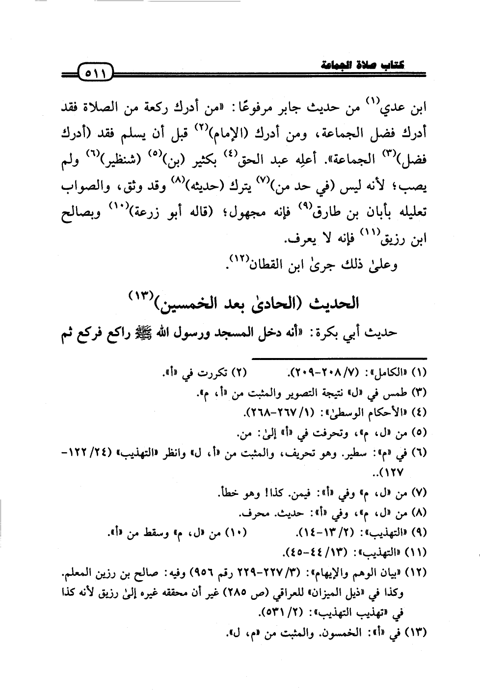 ابْن عدي من حَدِيث جَابر مَرْفُوعا: «من أدْرك رَكْعَة من الصَّلَاة فقد أدْرك فضل الْجَمَاعَة، وَمن أدْرك (الإِمَام) قبل أَن يسلم فقد (أدْرك فضل) الْجَمَاعَة» . أعلِه عبد الْحق بِكَثِير (بن) (شنظير) وَلم يصب؛ لِأَنَّهُ لَيْسَ (فِي حد من) يتْرك (حَدِيثه) وَقد وثق، وَالصَّوَاب تَعْلِيله بِأَبَان بن طَارق فَإِنَّهُ مَجْهُول؛ (قَالَه أَبُو زرْعَة) وبصالح بن رُزَيْق فَإِنَّهُ لَا يعرف.