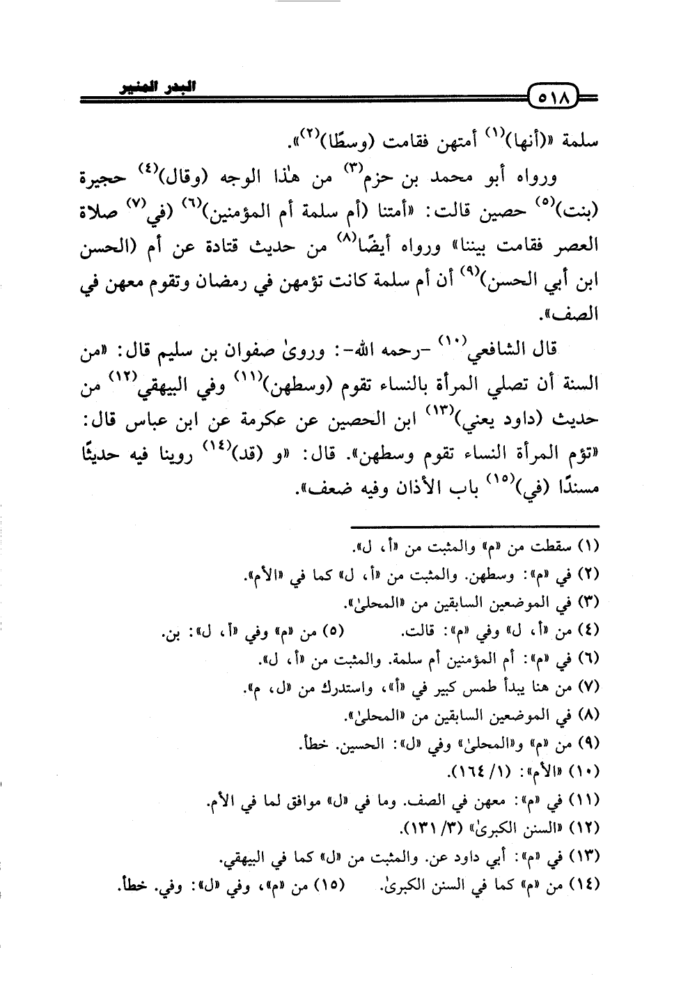 قَالَ الشَّافِعِي - رَحِمَهُ اللَّهُ -: وَرَوَى صَفْوَان بن سليم قَالَ: «من السّنة أَن تصلي الْمَرْأَة بِالنسَاء تقوم (وسطهن) وَفِي الْبَيْهَقِيّ من حَدِيث (دَاوُد يَعْنِي) ابْن الْحصين عَن عِكْرِمَة عَن ابْن عَبَّاس قَالَ: «تؤم الْمَرْأَة النِّسَاء تقوم وسطهن» . قَالَ: «و (قد) روينَا فِيهِ حَدِيثا مُسْندًا (فِي) بَاب الْأَذَان وَفِيه ضعف» .