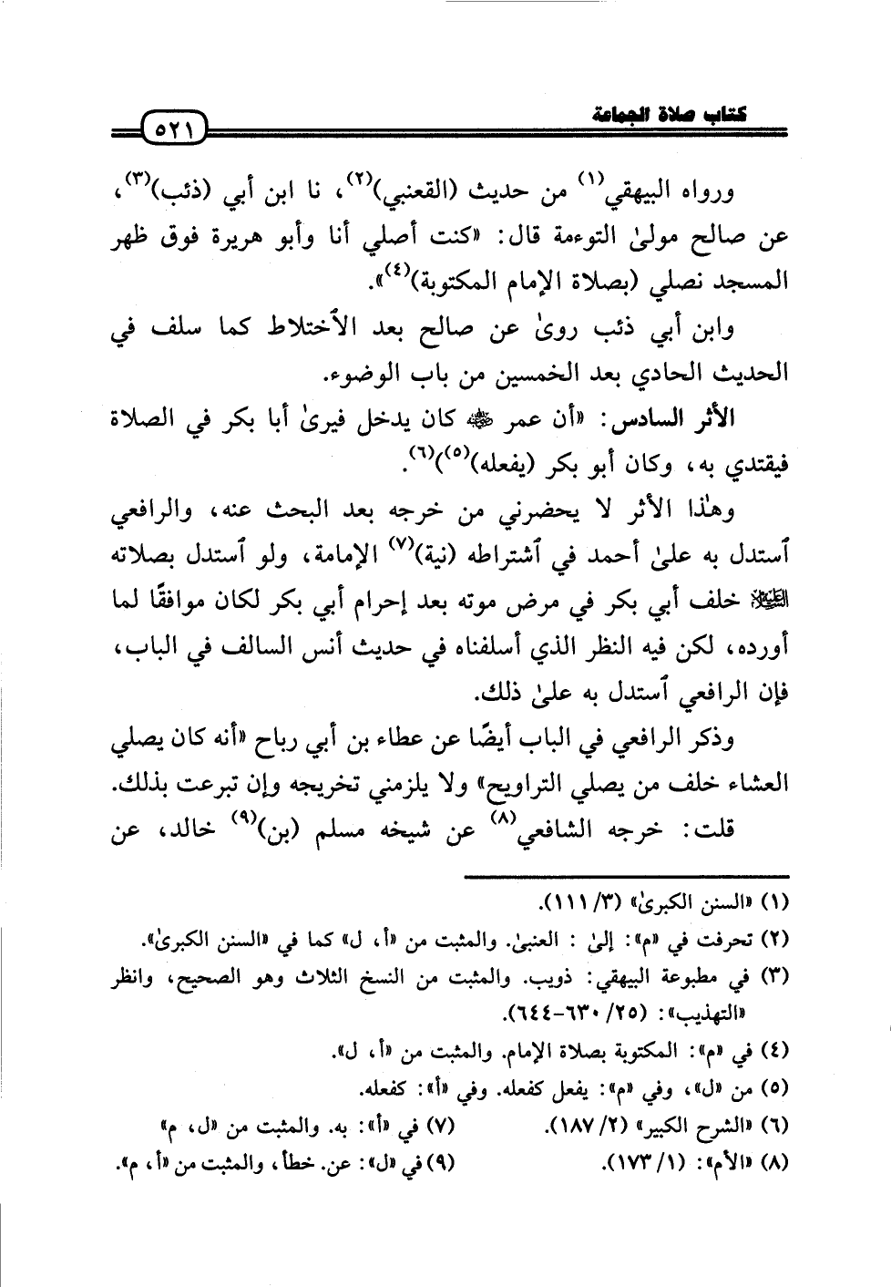 الْأَثر السَّادِس: «أَن عمر رَضِيَ اللَّهُ عَنْه كَانَ يدْخل فَيرَى أَبَا بكر فِي الصَّلَاة فيقتدي بِهِ، وَكَانَ أَبُو بكر (يَفْعَله)) .