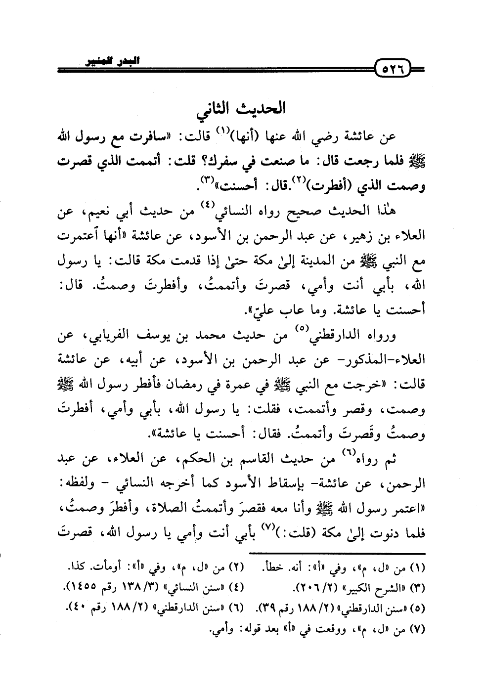 هَذَا الحَدِيث صَحِيح رَوَاهُ النَّسَائِيّ من حَدِيث أبي نعيم، عَن الْعَلَاء بن زُهَيْر، عَن عبد الرَّحْمَن بن الْأسود، عَن عَائِشَة «أَنَّهَا اعْتَمَرت مَعَ النَّبِي - صَلَّى الله عَلَيْهِ وَسلم - من الْمَدِينَة إِلَى مَكَّة حَتَّى إِذا قدمت مَكَّة قَالَت: يَا رَسُول الله، بِأبي أَنْت وَأمي، قصرتَ وأتممتُ، وأفطرتَ وصمتُ. قَالَ: أَحْسَنت يَا عَائِشَة. وَمَا عَابَ عليّ» .