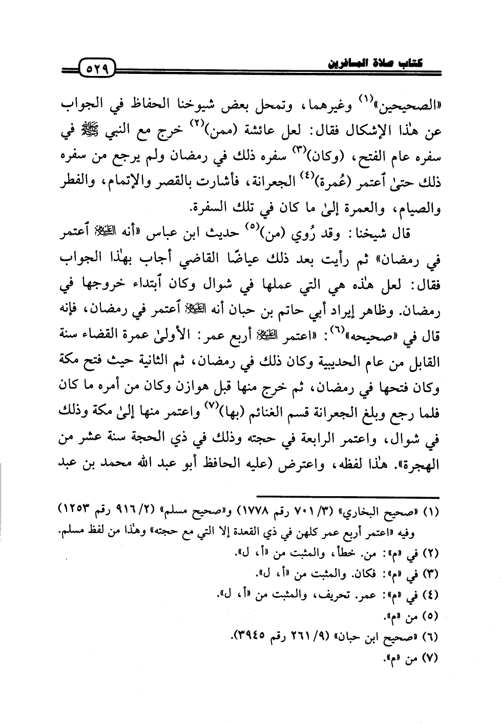 «الصَّحِيحَيْنِ» وَغَيرهمَا، وتمحل بعض شُيُوخنَا الْحفاظ فِي الْجَواب عَن هَذَا الْإِشْكَال فَقَالَ: لَعَلَّ عَائِشَة (مِمَّن) خرج مَعَ النَّبِي - صَلَّى الله عَلَيْهِ وَسلم - فِي سَفَره عَام الْفَتْح، (وَكَانَ) سَفَره ذَلِك فِي رَمَضَان وَلم يرجع من سَفَره ذَلِك حَتَّى اعْتَمر (عُمرة) الْجِعِرَّانَة، فَأَشَارَتْ بِالْقصرِ والإتمام، وَالْفطر وَالصِّيَام، وَالْعمْرَة إِلَى مَا كَانَ فِي تِلْكَ السفرة.