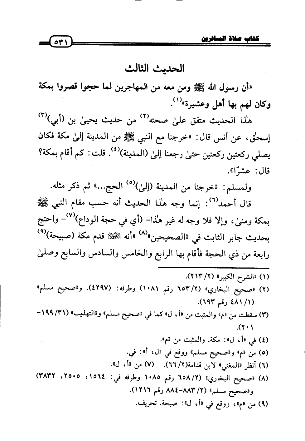 هَذَا الحَدِيث مُتَّفق عَلَى صِحَّته من حَدِيث يَحْيَى بن (أبي) إِسْحَاق، عَن أنس قَالَ: «خرجنَا مَعَ النَّبِي - صَلَّى الله عَلَيْهِ وَسلم - من الْمَدِينَة إِلَى مَكَّة فَكَانَ يُصَلِّي رَكْعَتَيْنِ رَكْعَتَيْنِ حَتَّى رَجعْنَا إِلَى (الْمَدِينَة) . قلت: كم أَقَامَ بِمَكَّة؟ قَالَ: عشرا» .