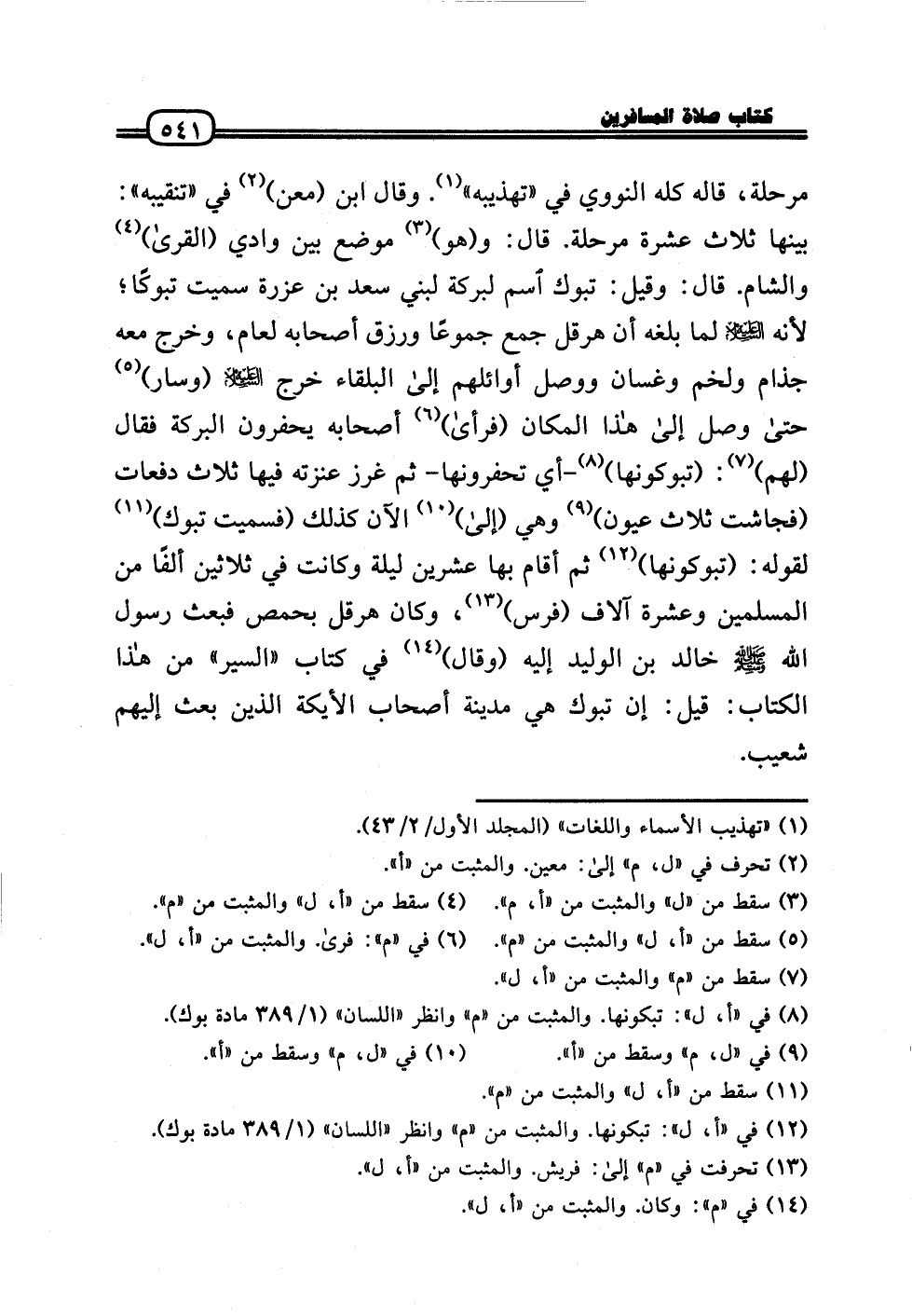 مرحلة، قَالَه كُله النَّوَوِيّ فِي «تهذيبه» . وَقَالَ ابْن (معن) فِي «تنقيبه» : بَينهَا ثَلَاث عشرَة مرحلة. قَالَ: و (هُوَ) مَوضِع بَين وَادي (الْقرى) وَالشَّام. قَالَ: وَقيل: تَبُوك اسْم لبركة لبني سعد بن عزْرَة سميت تَبُوكا؛ لِأَنَّهُ عَلَيْهِ السَّلَام لما بلغه أَن هِرقل جمع جموعًا ورزق أَصْحَابه لعام، وَخرج مَعَه جذام ولخم وغسان وَوصل أوائلهم إِلَى البلقاء خرج عَلَيْهِ السَّلَام (وَسَار) حَتَّى وصل إِلَى هَذَا الْمَكَان (فَرَأَى) أَصْحَابه يحفرون الْبركَة فَقَالَ (لَهُم) : (تبوكونها) - أَي تحفرونها - ثمَّ غرز عنزته فِيهَا ثَلَاث دفعات (فَجَاشَتْ ثَلَاث عُيُون) وَهِي (إِلَى) الْآن كَذَلِك (فسميت تَبُوك) لقَوْله: (تبوكونها) ثمَّ أَقَامَ بهَا عشْرين لَيْلَة وَكَانَت فِي ثَلَاثِينَ ألفا من الْمُسلمين وَعشرَة آلَاف (فرس) ، وَكَانَ هِرقل بحمص فَبعث رَسُول الله - صَلَّى الله عَلَيْهِ وَسلم - خَالِد بن الْوَلِيد إِلَيْهِ (وَقَالَ) فِي كتاب «السّير» من هَذَا الْكتاب: قيل: إِن تَبُوك هِيَ مَدِينَة أَصْحَاب الأيكة الَّذين بعث إِلَيْهِم شُعَيْب.