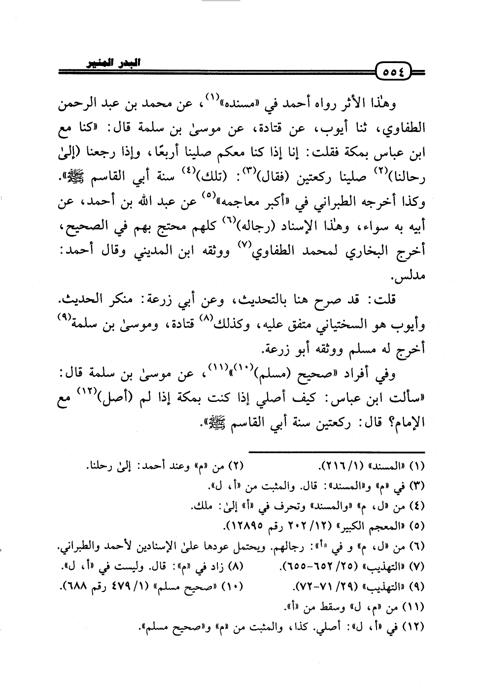وَهَذَا الْأَثر رَوَاهُ أَحْمد فِي «مُسْنده» ، عَن مُحَمَّد بن عبد الرَّحْمَن الطفَاوِي، ثَنَا أَيُّوب، عَن قَتَادَة، عَن مُوسَى بن سَلمَة قَالَ: «كُنَّا مَعَ ابْن عَبَّاس بِمَكَّة فَقلت: إِنَّا إِذا كُنَّا مَعكُمْ صلينَا أَرْبعا، وَإِذا رَجعْنَا (إِلَى رحالنا) صلينَا رَكْعَتَيْنِ (فَقَالَ) : (تِلْكَ) سنة أبي الْقَاسِم - صَلَّى الله عَلَيْهِ وَسلم -» . وَكَذَا أخرجه الطَّبَرَانِيّ فِي «أكبر معاجمه» عَن عبد الله بن أَحْمد، عَن أَبِيه بِهِ سَوَاء، وَهَذَا الْإِسْنَاد (رِجَاله) كلهم مُحْتَج بهم فِي الصَّحِيح، أخرج البُخَارِيّ لمُحَمد الطفَاوِي وَوَثَّقَهُ ابْن الْمَدِينِيّ وَقَالَ أَحْمد: مُدَلّس.