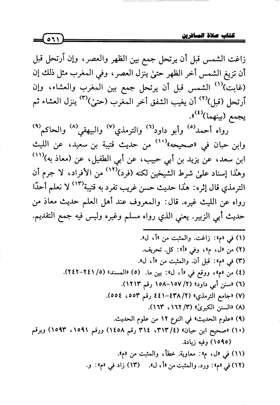 رَوَاهُ أَحْمد وَأَبُو دَاوُد وَالتِّرْمِذِيّ وَالْبَيْهَقِيّ وَالْحَاكِم وَابْن حبَان فِي «صَحِيحه» من حَدِيث قُتَيْبَة بن سعيد، عَن اللَّيْث بن سعد، عَن يزِيد بن أبي حبيب، عَن أبي الطُّفَيْل، عَن (معَاذ بِهِ) وَهَذَا إِسْنَاد عَلَى شَرط الشَّيْخَيْنِ لكنه (فَرد) من الْأَفْرَاد، لَا جرم أَن التِّرْمِذِيّ قَالَ إثره: هَذَا حَدِيث حسن غَرِيب تفرد بِهِ قُتَيْبَة لَا نعلم أحدا رَوَاهُ عَن اللَّيْث غَيره. قَالَ: وَالْمَعْرُوف عِنْد أهل الْعلم حَدِيث معَاذ من حَدِيث أبي الزبير. يَعْنِي الَّذِي رَوَاهُ مُسلم وَغَيره وَلَيْسَ فِيهِ جمع التَّقْدِيم.
