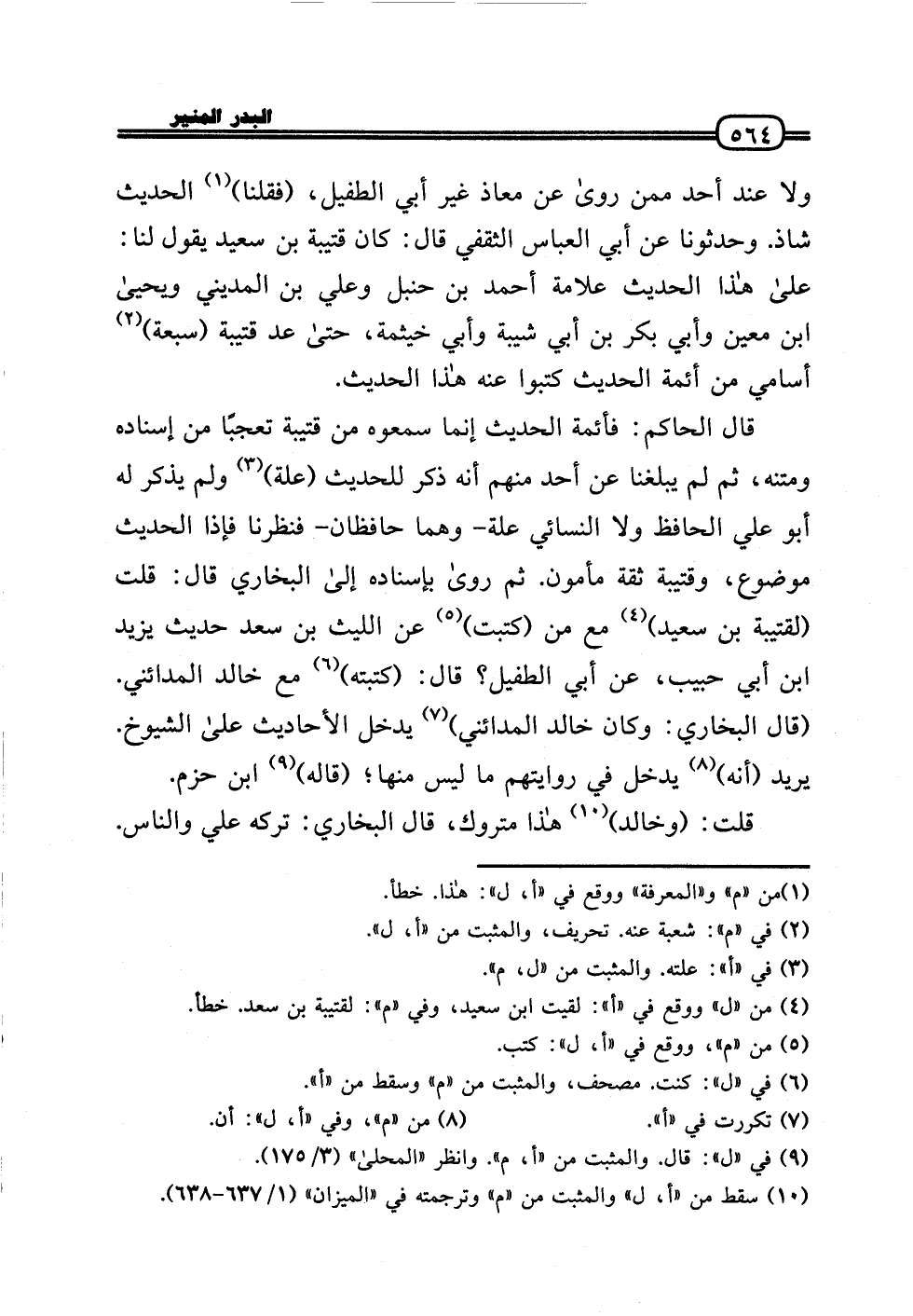 وَلَا عِنْد أحد مِمَّن رَوَى عَن معَاذ غير أبي الطُّفَيْل، (فَقُلْنَا) الحَدِيث شَاذ. وحدثونا عَن أبي الْعَبَّاس الثَّقَفِيّ قَالَ: كَانَ قُتَيْبَة بن سعيد يَقُول لنا: عَلَى هَذَا الحَدِيث عَلامَة أَحْمد بن حَنْبَل وَعلي بن الْمَدِينِيّ وَيَحْيَى بن معِين وَأبي بكر بن أبي شيبَة وَأبي خَيْثَمَة، حَتَّى عد قُتَيْبَة (سَبْعَة) أسامي من أَئِمَّة الحَدِيث كتبُوا عَنهُ هَذَا الحَدِيث.
