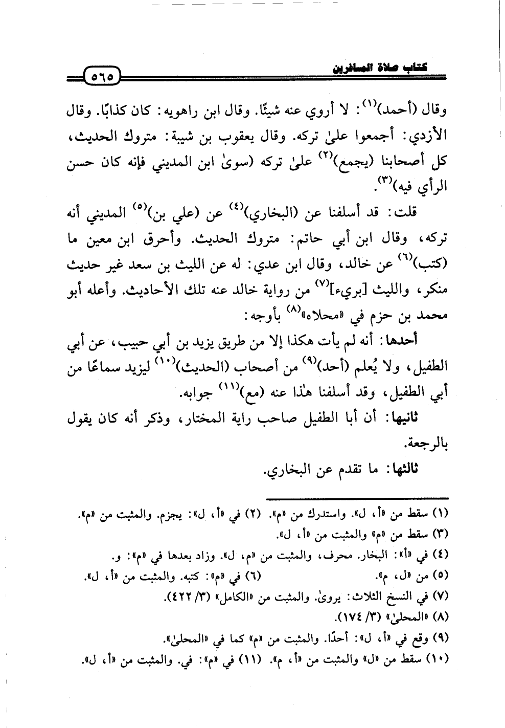 قلت: قد أسلفنا عَن (البُخَارِيّ) عَن (عَلّي بن) الْمَدِينِيّ أَنه تَركه، وَقَالَ ابْن أبي حَاتِم: مَتْرُوك الحَدِيث. وأحرق ابْن معِين مَا (كتب) عَن خَالِد، وَقَالَ ابْن عدي: لَهُ عَن اللَّيْث بن سعد غير حَدِيث مُنكر، وَاللَّيْث [بَرِيء] من رِوَايَة خَالِد عَنهُ تِلْكَ الْأَحَادِيث. وَأعله أَبُو مُحَمَّد بن حزم فِي «محلاه» بأوجه: