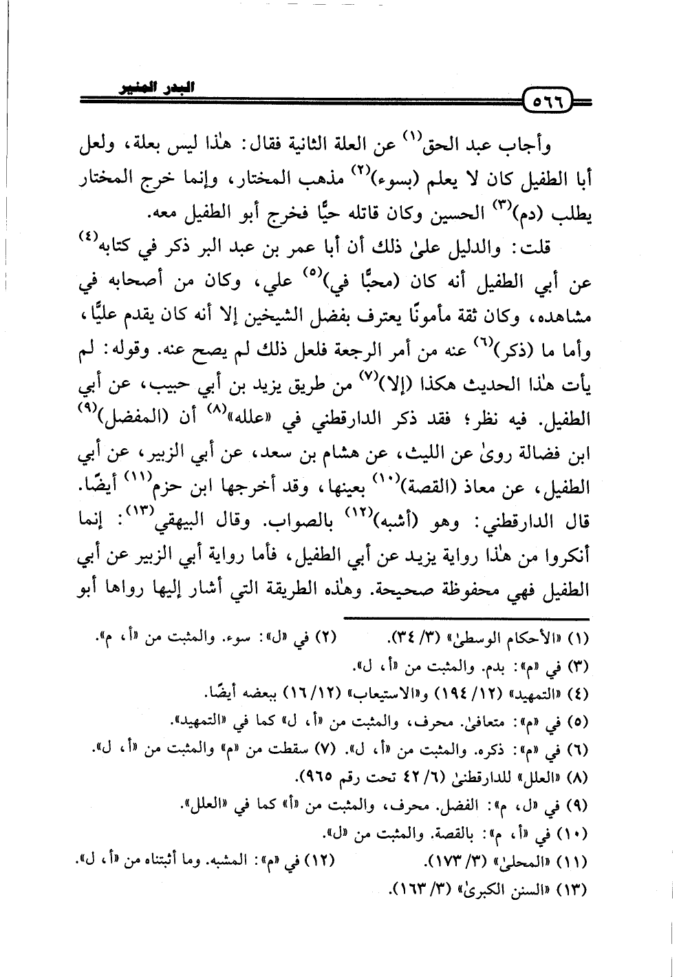 وَأجَاب عبد الْحق عَن الْعلَّة الثَّانِيَة فَقَالَ: هَذَا لَيْسَ بعلة، وَلَعَلَّ أَبَا الطُّفَيْل كَانَ لَا يعلم (بِسوء) مَذْهَب الْمُخْتَار، وَإِنَّمَا خرج الْمُخْتَار يطْلب (دم) الْحُسَيْن وَكَانَ قَاتله حيًّا فَخرج أَبُو الطُّفَيْل مَعَه.