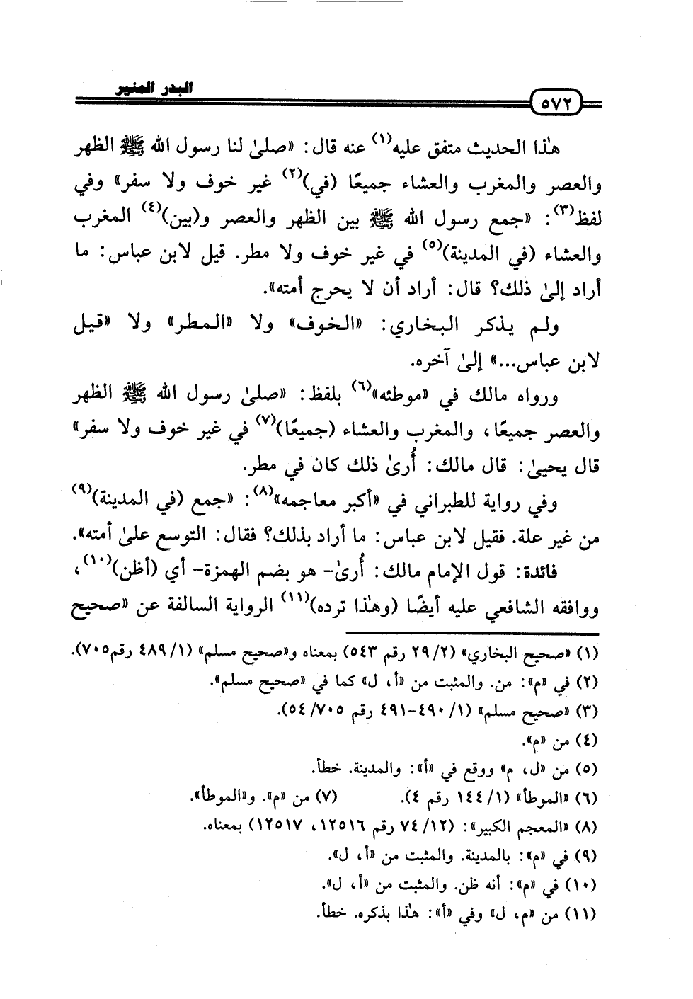 وَرَوَاهُ مَالك فِي «موطئِهِ» بِلَفْظ: «صَلَّى رَسُول الله - صَلَّى الله عَلَيْهِ وَسلم - الظّهْر وَالْعصر جَمِيعًا، وَالْمغْرب وَالْعشَاء (جَمِيعًا) فِي غير خوف وَلَا سفر» قَالَ يَحْيَى: قَالَ مَالك: أُرى ذَلِك كَانَ فِي مطر.