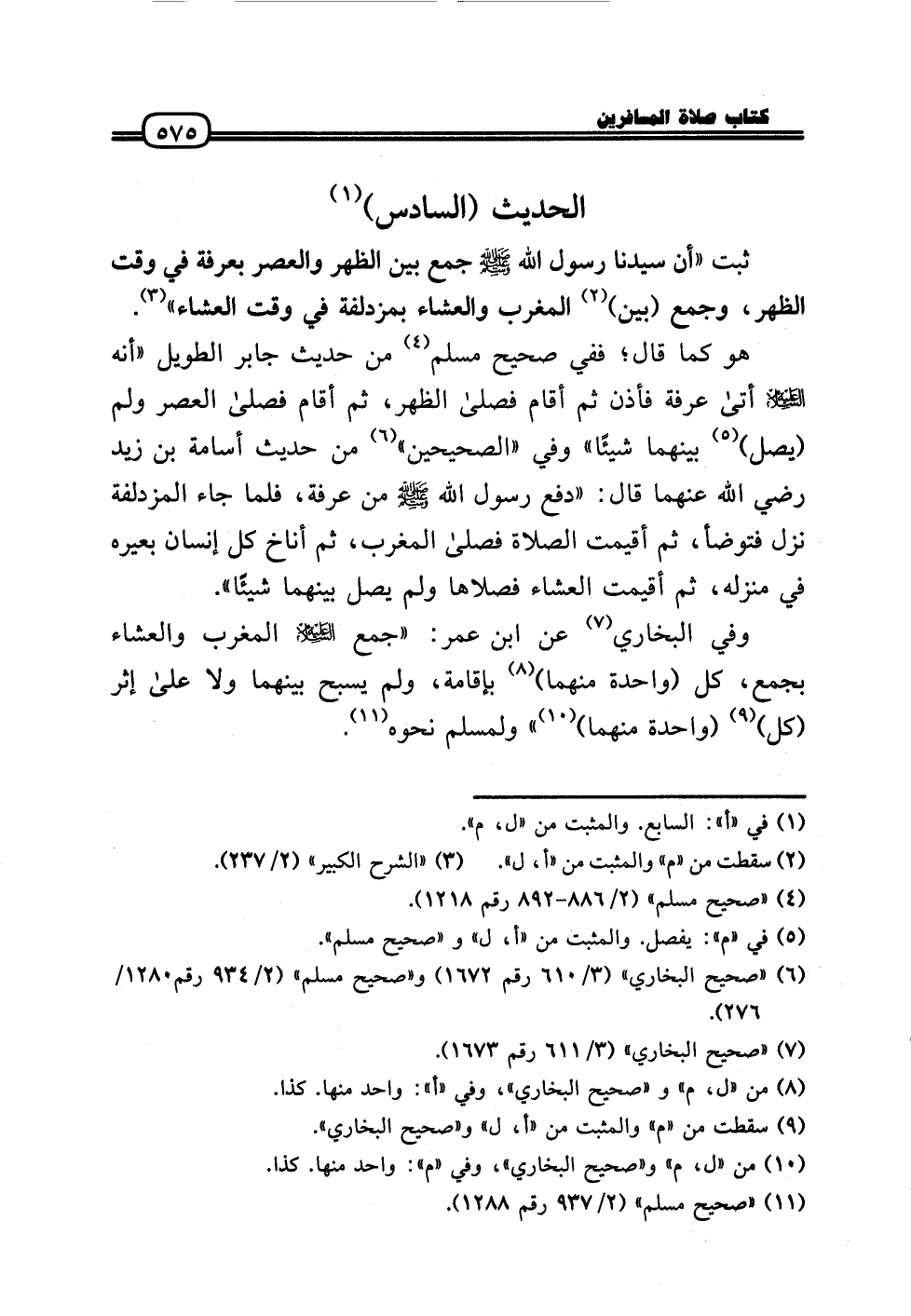 ثَبت «أَن سيدنَا رَسُول الله - صَلَّى الله عَلَيْهِ وَسلم - جمع بَين الظّهْر وَالْعصر بِعَرَفَة فِي وَقت الظّهْر، وَجمع (بَين) الْمغرب وَالْعشَاء بِمُزْدَلِفَة فِي وَقت الْعشَاء» .