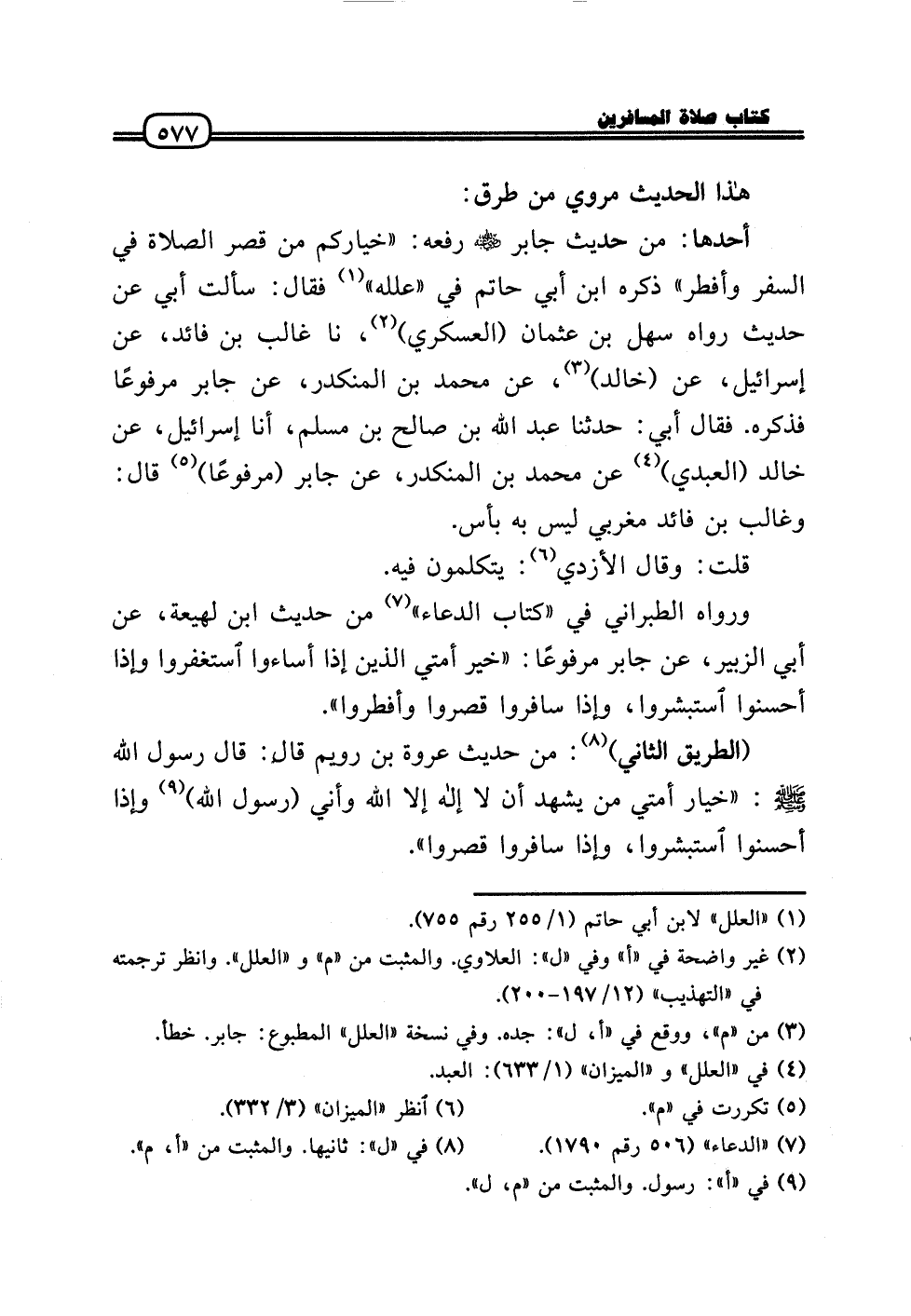 أَحدهَا: من حَدِيث جَابر رَضِيَ اللَّهُ عَنْه رَفعه: «خياركم من قصر الصَّلَاة فِي السّفر وَأفْطر» ذكره ابْن أبي حَاتِم فِي «علله» فَقَالَ: سَأَلت أبي عَن حَدِيث رَوَاهُ سهل بن عُثْمَان (العسكري) ، نَا غَالب بن فائد، عَن إِسْرَائِيل، عَن (خَالِد) ، عَن مُحَمَّد بن الْمُنْكَدر، عَن جَابر مَرْفُوعا ... فَذكره. فَقَالَ أبي: حَدثنَا عبد الله بن صَالح بن مُسلم، أَنا إِسْرَائِيل، عَن خَالِد (الْعَبْدي) عَن مُحَمَّد بن الْمُنْكَدر، عَن جَابر (مَرْفُوعا) قَالَ: وغالب بن فائد مغربي لَيْسَ بِهِ بَأْس.