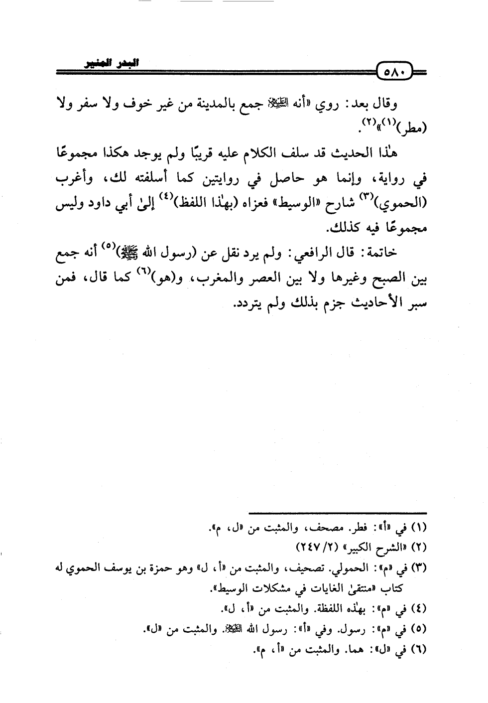 وَقَالَ بعد: رُوِيَ «أَنه عَلَيْهِ السَّلَام جمع بِالْمَدِينَةِ من غير خوف وَلَا سفر وَلَا (مطر) » .