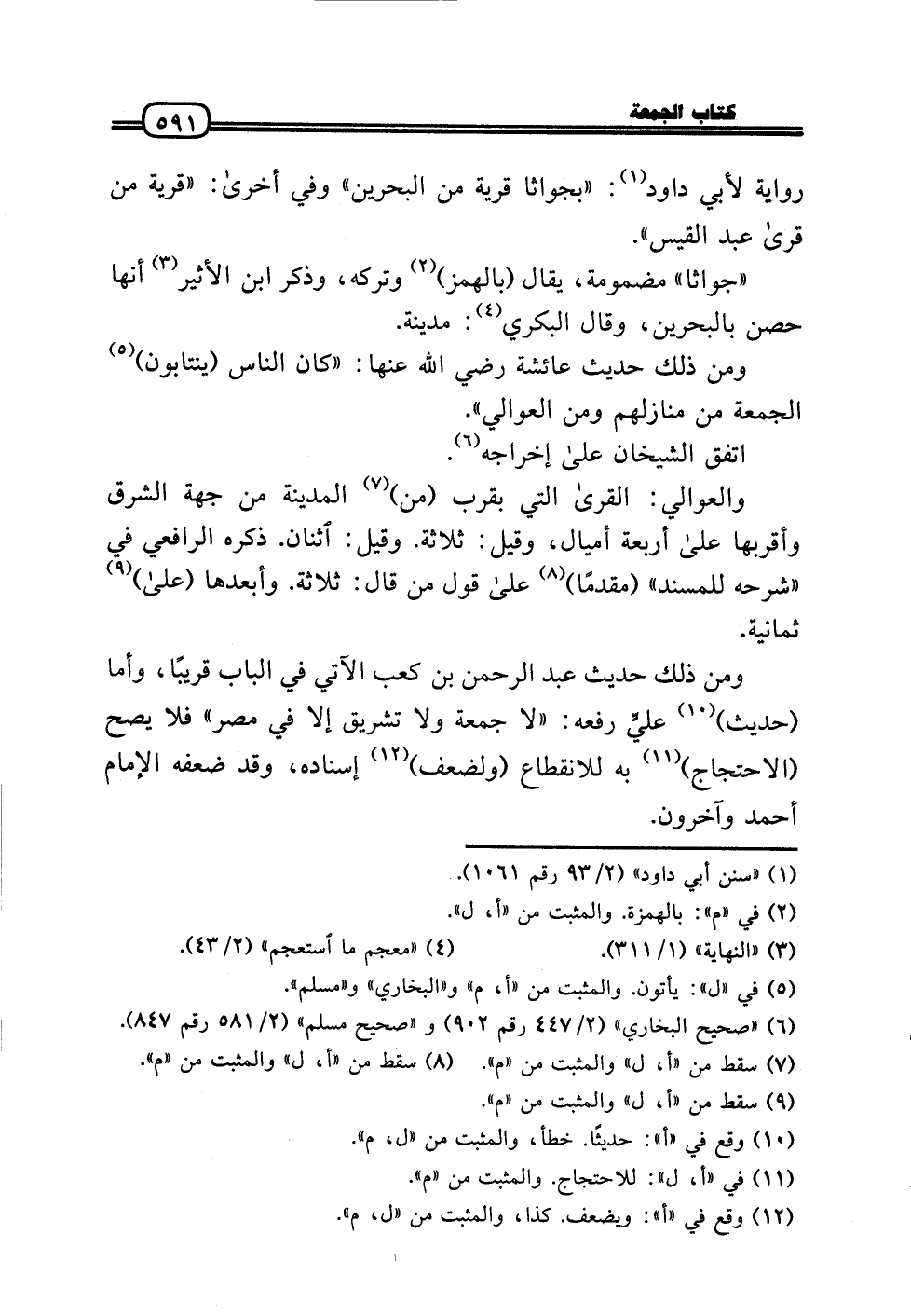 وَمن ذَلِك حَدِيث عبد الرَّحْمَن بن كَعْب الْآتِي فِي الْبَاب قَرِيبا، وَأما (حَدِيث) عليٍّ رَفعه: «لَا جُمُعَة وَلَا تَشْرِيق إِلَّا فِي مصر» فَلَا يَصح (الِاحْتِجَاج) بِهِ للانقطاع (ولضعف) إِسْنَاده، وَقد ضعفه الإِمَام أَحْمد وَآخَرُونَ.
