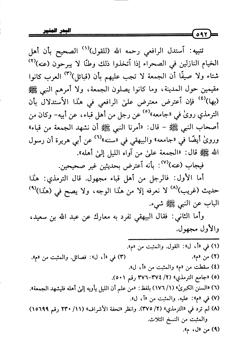 تَنْبِيه: اسْتدلَّ الرَّافِعِيّ رَحِمَهُ اللَّهُ (لِلْقَوْلِ) الصَّحِيح بِأَن أهل الْخيام النازلين فِي الصَّحرَاء إِذا اتَّخذُوا ذَلِك وطنًا لَا يبرحون (عَنهُ) شتاء وَلَا صيفًا أَن الْجُمُعَة لَا تجب عَلَيْهِم بِأَن (قبائل) الْعَرَب كَانُوا مقيمين حول الْمَدِينَة، وَمَا كَانُوا يصلونَ الْجُمُعَة، وَلَا أَمرهم النَّبِي - صَلَّى الله عَلَيْهِ وَسلم - (بهَا) فَإِن اعْترض معترض عَلَى الرَّافِعِيّ فِي هَذَا الِاسْتِدْلَال بِأَن التِّرْمِذِيّ رَوَى فِي «جَامعه» عَن رجل من أهل قبَاء، عَن أَبِيه - وَكَانَ من أَصْحَاب النَّبِي - صَلَّى الله عَلَيْهِ وَسلم - قَالَ: «أمرنَا النَّبِي - صَلَّى الله عَلَيْهِ وَسلم - أَن نشْهد الْجُمُعَة من قبَاء» وَرَوَى أَيْضا فِي «جَامعه» وَالْبَيْهَقِيّ فِي «سنَنه» عَن أبي هُرَيْرَة أَن رَسُول الله - صَلَّى الله عَلَيْهِ وَسلم - قَالَ: «الْجُمُعَة عَلَى من آواه اللَّيْل إِلَى أَهله» .