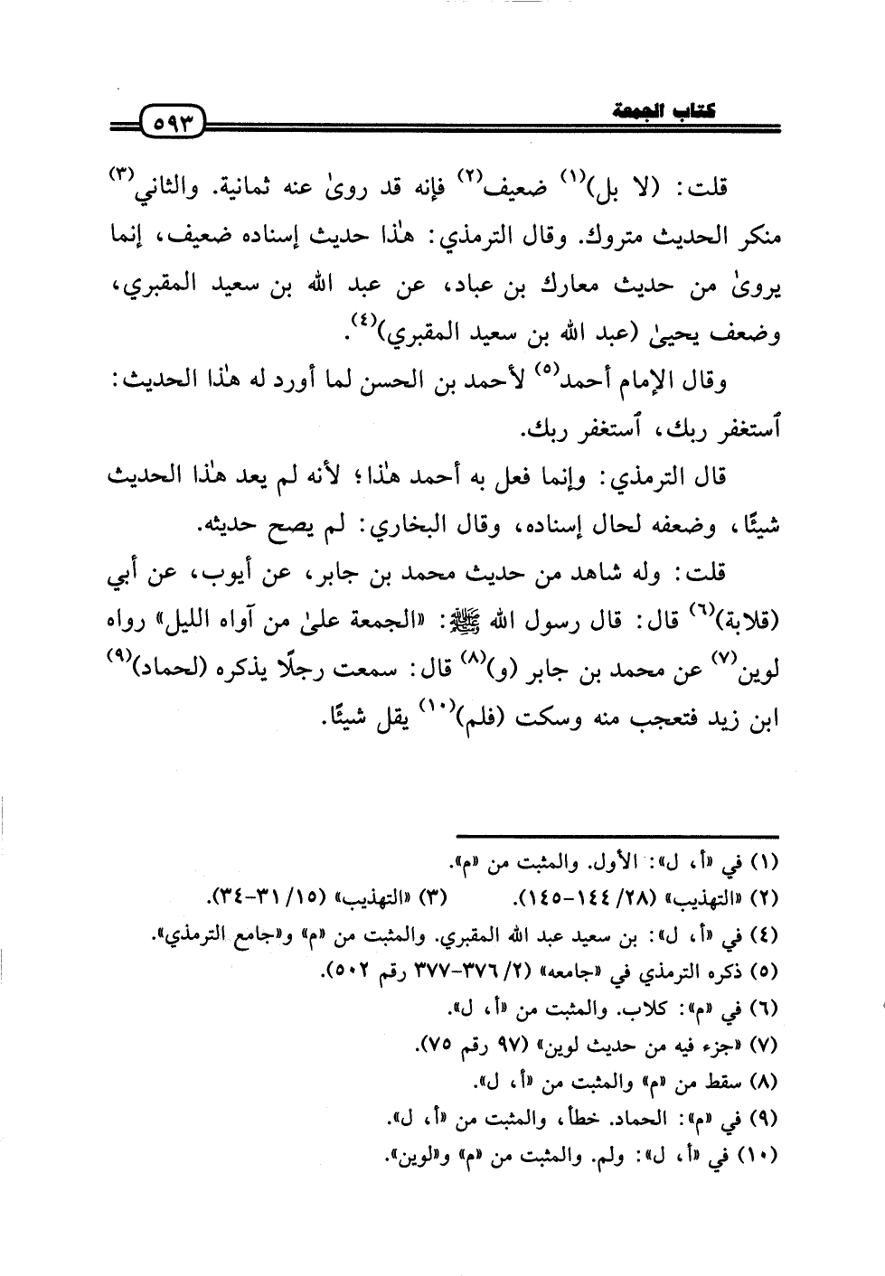 قلت: وَله شَاهد من حَدِيث مُحَمَّد بن جَابر، عَن أَيُّوب، عَن أبي (قلَابَة) قَالَ: قَالَ رَسُول الله - صَلَّى الله عَلَيْهِ وَسلم -: «الْجُمُعَة عَلَى من آواه اللَّيْل» رَوَاهُ لوين عَن مُحَمَّد بن جَابر (و) قَالَ: سَمِعت رجلا يذكرهُ (لحماد) بن زيد فتعجب مِنْهُ وَسكت (فَلم) يقل شَيْئا.