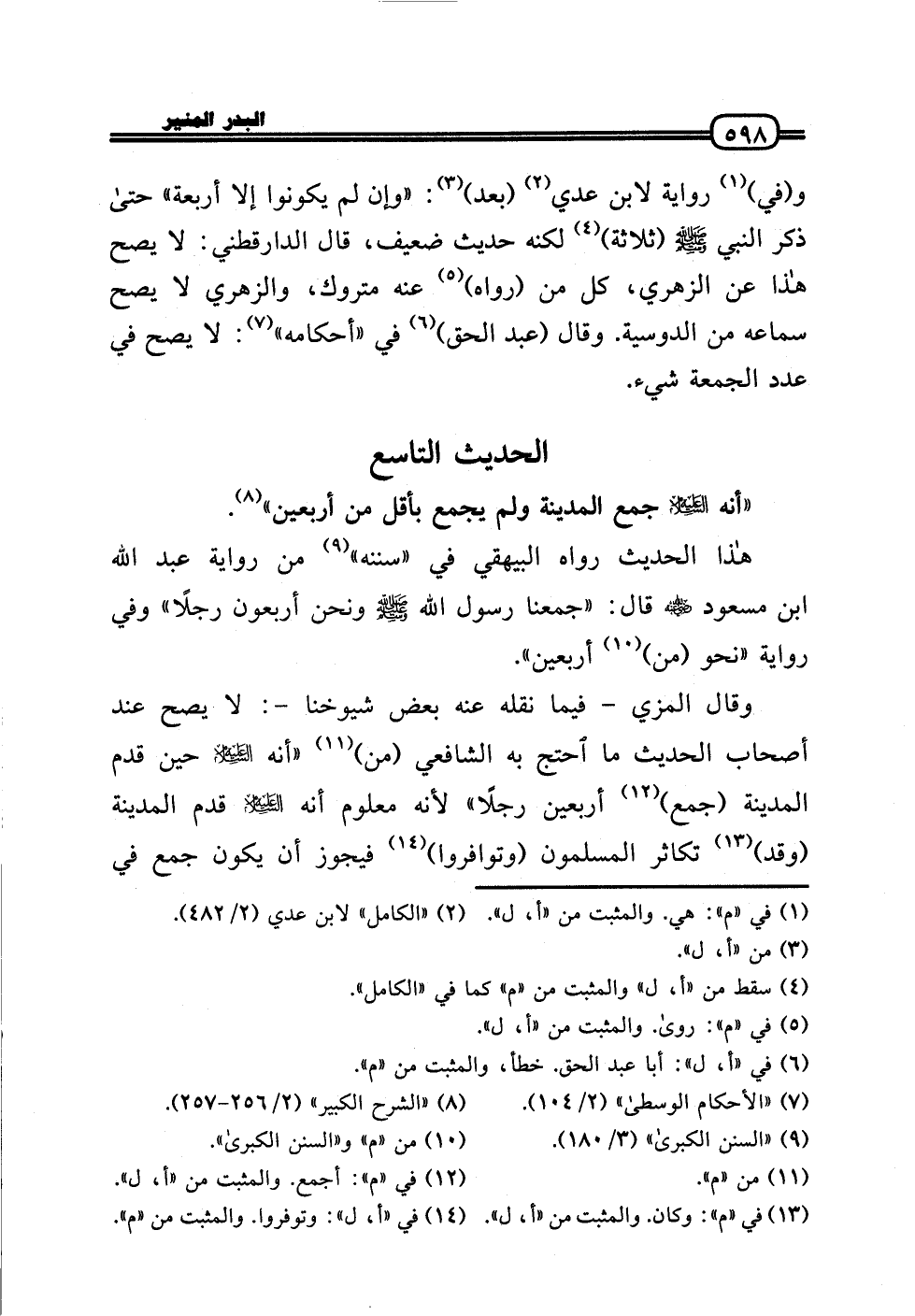 و (فِي) رِوَايَة لِابْنِ عدي (بعد) : «وَإِن لم يَكُونُوا إِلَّا أَرْبَعَة» حَتَّى ذكر النَّبِي - صَلَّى الله عَلَيْهِ وَسلم - (ثَلَاثَة) لكنه حَدِيث ضَعِيف، قَالَ الدَّارَقُطْنِيّ: لَا يَصح هَذَا عَن الزُّهْرِيّ، كل من (رَوَاهُ) عَنهُ مَتْرُوك، وَالزهْرِيّ لَا يَصح سَمَاعه من الدوسية. وَقَالَ (عبد الْحق) فِي «أَحْكَامه» : لَا يَصح فِي عدد الْجُمُعَة شَيْء.