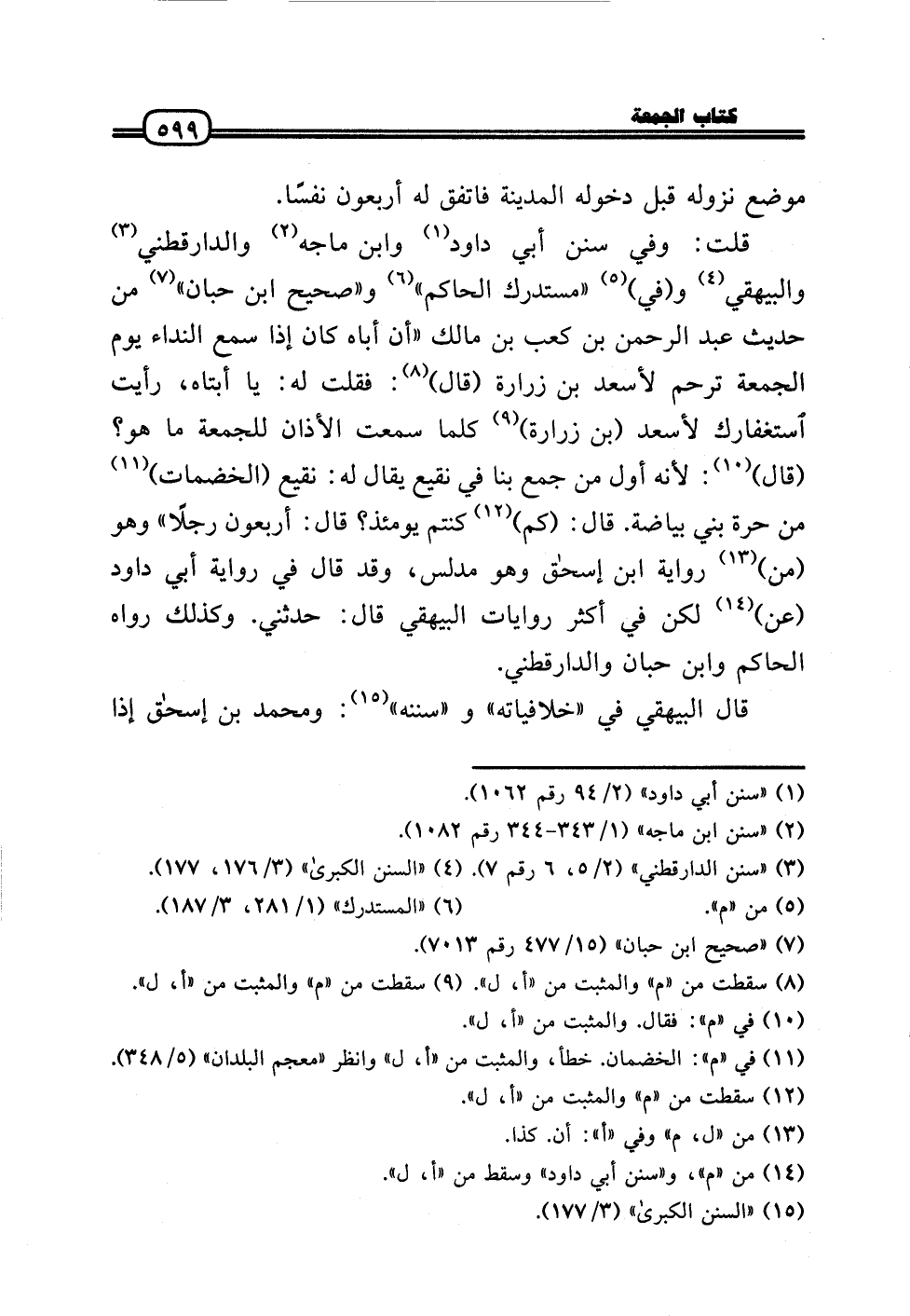 قلت: وَفِي سنَن أبي دَاوُد وَابْن مَاجَه وَالدَّارَقُطْنِيّ وَالْبَيْهَقِيّ و (فِي) «مُسْتَدْرك الْحَاكِم» و «صَحِيح ابْن حبَان» من حَدِيث عبد الرَّحْمَن بن كَعْب بن مَالك «أَن أَبَاهُ كَانَ إِذا سمع النداء يَوْم الْجُمُعَة ترحم لأسعد بن زُرَارَة (قَالَ) : فَقلت لَهُ: يَا أبتاه، رَأَيْت استغفارك لأسعد (بن زُرَارَة) كلما سَمِعت الْأَذَان للْجُمُعَة مَا هُوَ؟ (قَالَ) : لِأَنَّهُ أول من جمع بِنَا فِي نَقِيع يُقَال لَهُ: نَقِيع (الْخضمات) من حرَّة بني بياضة. قَالَ: (كم) كُنْتُم يَوْمئِذٍ؟ قَالَ: أَرْبَعُونَ رجلا» وَهُوَ (من) رِوَايَة ابْن إِسْحَاق وَهُوَ مُدَلّس، وَقد قَالَ فِي رِوَايَة أبي دَاوُد (عَن) لَكِن فِي أَكثر رِوَايَات الْبَيْهَقِيّ قَالَ: حَدثنِي. وَكَذَلِكَ رَوَاهُ الْحَاكِم وَابْن حبَان وَالدَّارَقُطْنِيّ.