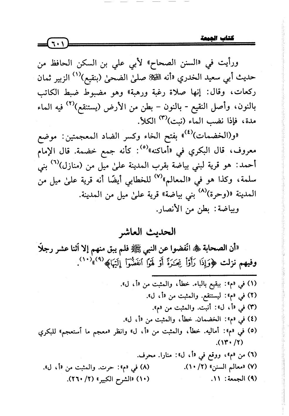 وَرَأَيْت فِي «السّنَن الصِّحَاح» لأبي عَلّي بن السكن الْحَافِظ من حَدِيث أبي سعيد الْخُدْرِيّ «أَنه عَلَيْهِ السَّلَام صَلَّى الضُّحَى (بنقيع) الزبير ثَمَان رَكْعَات، وَقَالَ: إِنَّهَا صَلَاة رَغْبَة وَرَهْبَة» وَهُوَ مضبوط ضبط الْكَاتِب بالنُّون، وأصل النقيع - بالنُّون - بطن من الأَرْض (يستنقع) فِيهِ المَاء مُدَّة، فَإِذا نضب المَاء (نبت) الْكلأ.