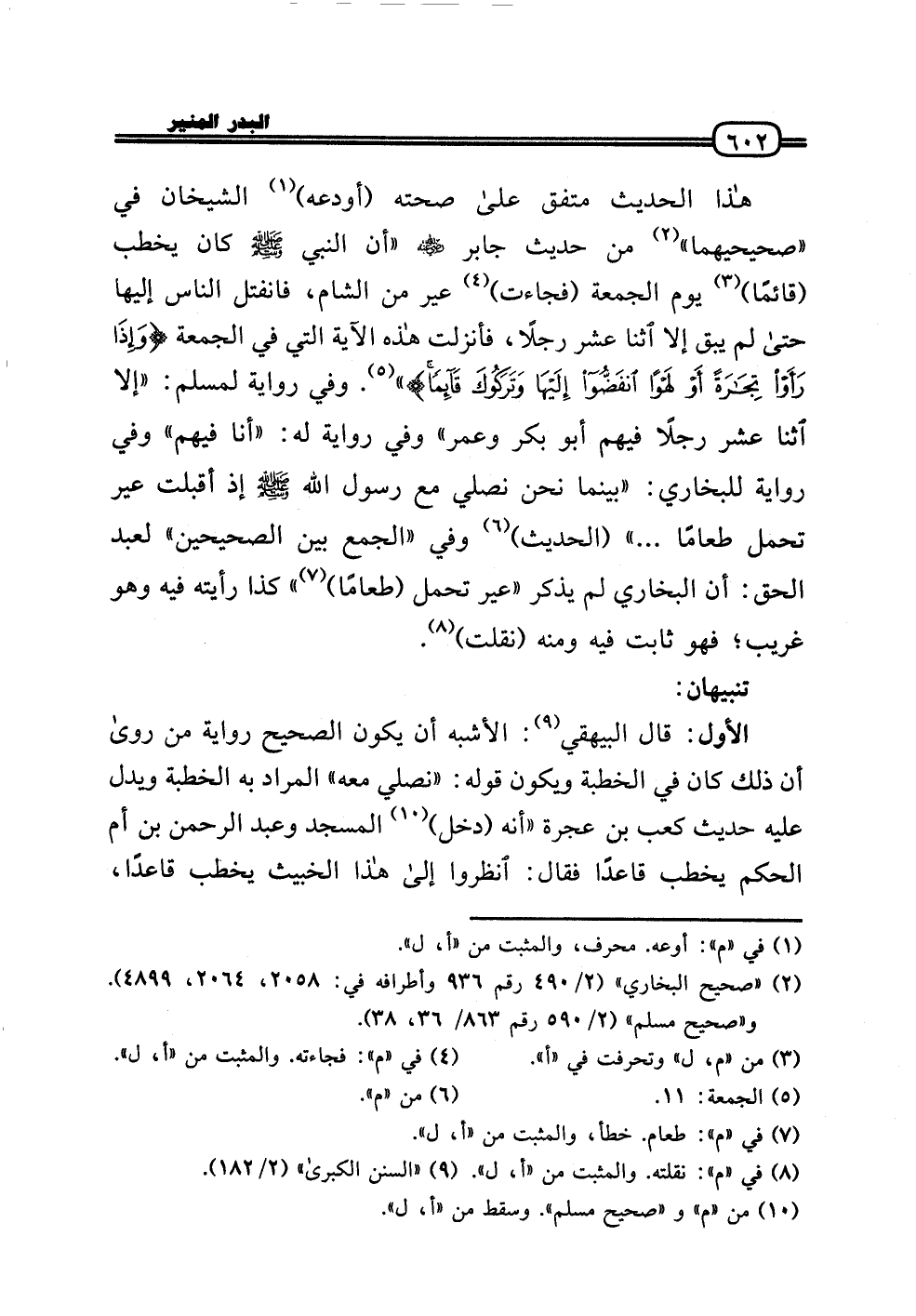 هَذَا الحَدِيث مُتَّفق عَلَى صِحَّته (أودعهُ) الشَّيْخَانِ فِي «صَحِيحَيْهِمَا» من حَدِيث جَابر رَضِيَ اللَّهُ عَنْه «أَن النَّبِي - صَلَّى الله عَلَيْهِ وَسلم - كَانَ يخْطب (قَائِما) يَوْم الْجُمُعَة (فَجَاءَت) عير من الشَّام، فَانْفَتَلَ النَّاس إِلَيْهَا حَتَّى لم يبْق إِلَّا اثْنَا عشر رجلا، فأنزلت هَذِه الْآيَة الَّتِي فِي الْجُمُعَة (وَإِذا رَأَوْا تِجَارَة أَو لهوًا انْفَضُّوا إِلَيْهَا وَتَرَكُوك قَائِما) » . وَفِي رِوَايَة لمُسلم: «إِلَّا اثْنَا عشر رجلا فيهم أَبُو بكر وَعمر» وَفِي رِوَايَة لَهُ: «أَنا فيهم» وَفِي رِوَايَة للْبُخَارِيّ: «بَيْنَمَا نَحن نصلي مَعَ رَسُول الله - صَلَّى الله عَلَيْهِ وَسلم - إِذْ أَقبلت عير تحمل طَعَاما ... » (الحَدِيث) وَفِي «الْجمع بَين الصَّحِيحَيْنِ» لعبد الْحق: أَن البُخَارِيّ لم يذكر «عير تحمل (طَعَاما) » كَذَا رَأَيْته فِيهِ وَهُوَ غَرِيب؛ فَهُوَ ثَابت فِيهِ وَمِنْه (نقلت) .