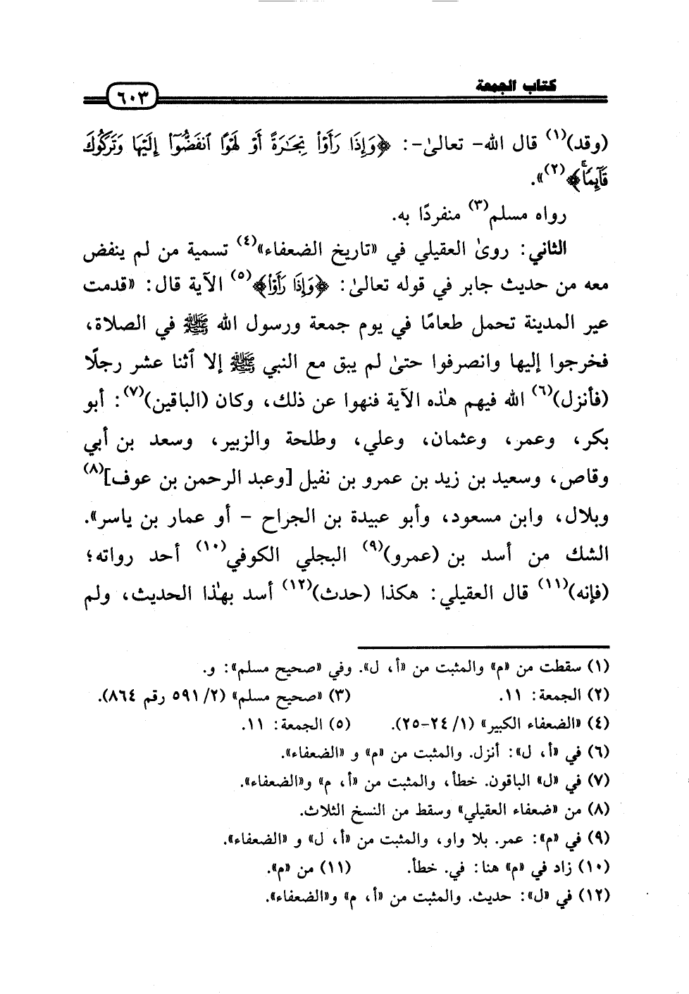 الثَّانِي: رَوَى الْعقيلِيّ فِي «تَارِيخ الضُّعَفَاء» تَسْمِيَة من لم ينفض مَعَه من حَدِيث جَابر فِي قَوْله تَعَالَى: (وَإِذا رَأَوْا) الْآيَة قَالَ: «قدمت عير الْمَدِينَة تحمل طَعَاما فِي يَوْم جُمُعَة وَرَسُول الله - صَلَّى الله عَلَيْهِ وَسلم - فِي الصَّلَاة، فَخَرجُوا إِلَيْهَا وَانْصَرفُوا حَتَّى لم يبْق مَعَ النَّبِي - صَلَّى الله عَلَيْهِ وَسلم - إِلَّا اثْنَا عشر رجلا (فَأنْزل) الله فيهم هَذِه الْآيَة فنهوا عَن ذَلِك، وَكَانَ (البَاقِينَ) : أَبُو بكر، وَعمر، وَعُثْمَان، وَعلي، وَطَلْحَة وَالزبير، وَسعد بن أبي وَقاص، وَسَعِيد بن زيد بن عَمْرو بن نفَيْل [وَعبد الرَّحْمَن بن عَوْف] وبلال، وَابْن مَسْعُود، وَأَبُو عُبَيْدَة بن الْجراح - أَو عمار بن يَاسر» . الشَّك من أَسد بن (عَمْرو) البَجلِيّ الْكُوفِي أحد رُوَاته؛ (فَإِنَّهُ) قَالَ الْعقيلِيّ: هَكَذَا (حدث) أَسد بِهَذَا الحَدِيث، وَلم