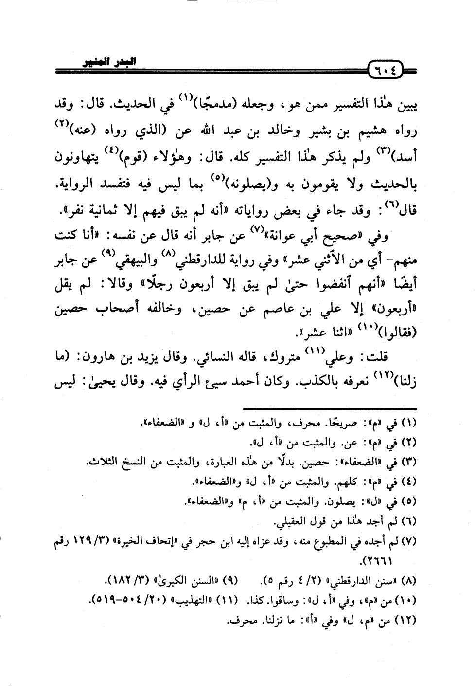 يبين هَذَا التَّفْسِير مِمَّن هُوَ، وَجعله (مدمجًا) فِي الحَدِيث. قَالَ: وَقد رَوَاهُ هشيم بن بشير وخَالِد بن عبد الله عَن (الَّذِي رَوَاهُ (عَنهُ) أَسد) وَلم يذكر هَذَا التَّفْسِير كُله. قَالَ: وَهَؤُلَاء (قوم) يتهاونون بِالْحَدِيثِ وَلَا يقومُونَ بِهِ و (يصلونه) بِمَا لَيْسَ فِيهِ فتفسد الرِّوَايَة. قَالَ: وَقد جَاءَ فِي بعض رواياته «أَنه لم يبْق فيهم إِلَّا ثَمَانِيَة نفر» .