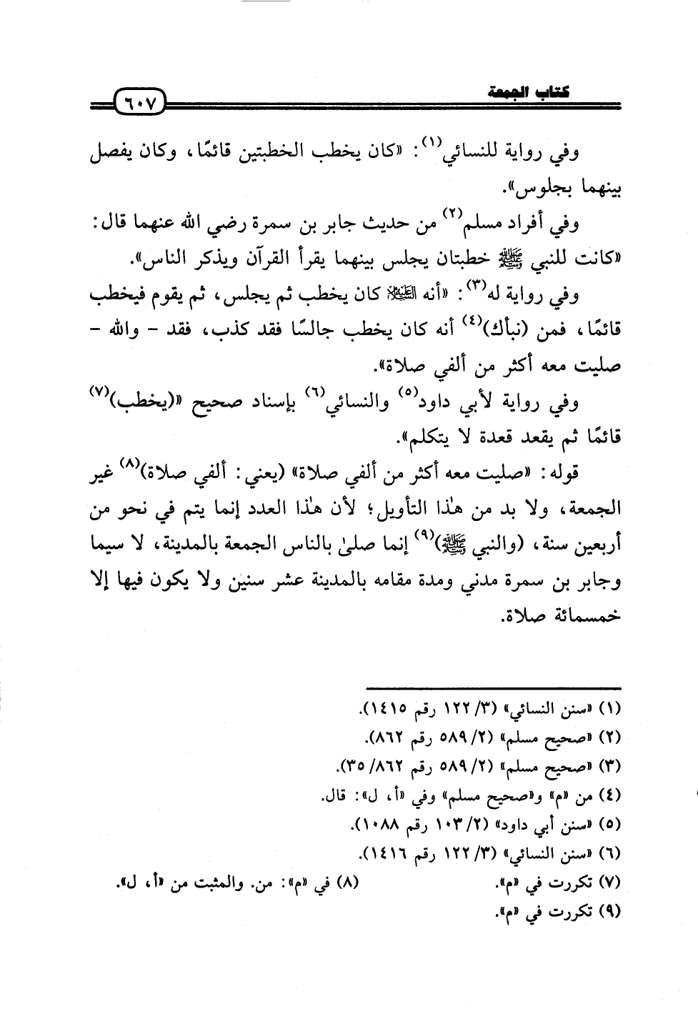 وَفِي رِوَايَة للنسائي: «كَانَ يخْطب الْخطْبَتَيْنِ قَائِما، وَكَانَ يفصل بَينهمَا بجلوس» .