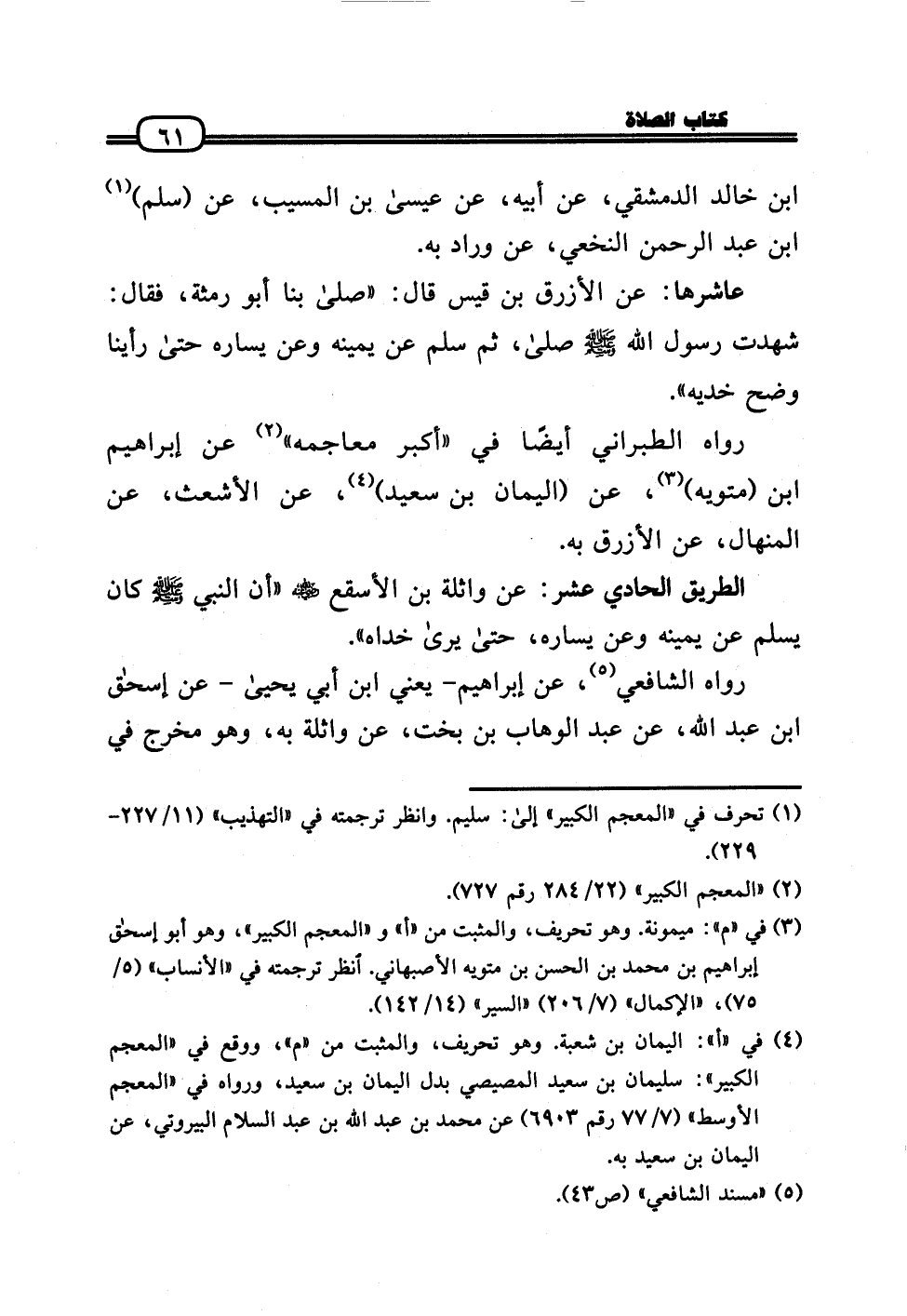 عَاشرهَا: عَن الْأَزْرَق بن قيس قَالَ: «صَلَّى بِنَا أَبُو رمثة، فَقَالَ: شهِدت رَسُول الله - صَلَّى الله عَلَيْهِ وَسلم - صَلَّى، ثمَّ سلم عَن يَمِينه وَعَن يسَاره حَتَّى رَأينَا وضح خديه» .