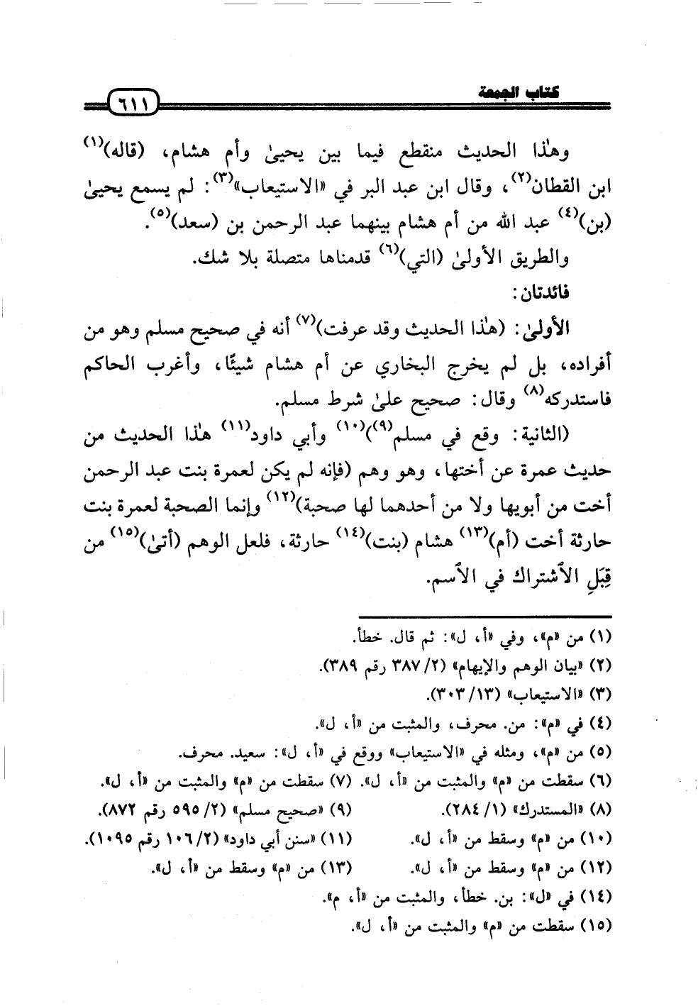 (الثَّانِيَة: وَقع فِي مُسلم) وَأبي دَاوُد هَذَا الحَدِيث من حَدِيث عمْرَة عَن أُخْتهَا، وَهُوَ وهم (فَإِنَّهُ لم يكن لعمرة بنت عبد الرَّحْمَن أُخْت من أَبَوَيْهَا وَلَا من أَحدهمَا لَهَا صُحْبَة) وَإِنَّمَا الصُّحْبَة لعمرة بنت حَارِثَة أُخْت (أم) هِشَام (بنت) حَارِثَة، فَلَعَلَّ الْوَهم (أَتَى) من قِبَلِ الِاشْتِرَاك فِي الِاسْم.