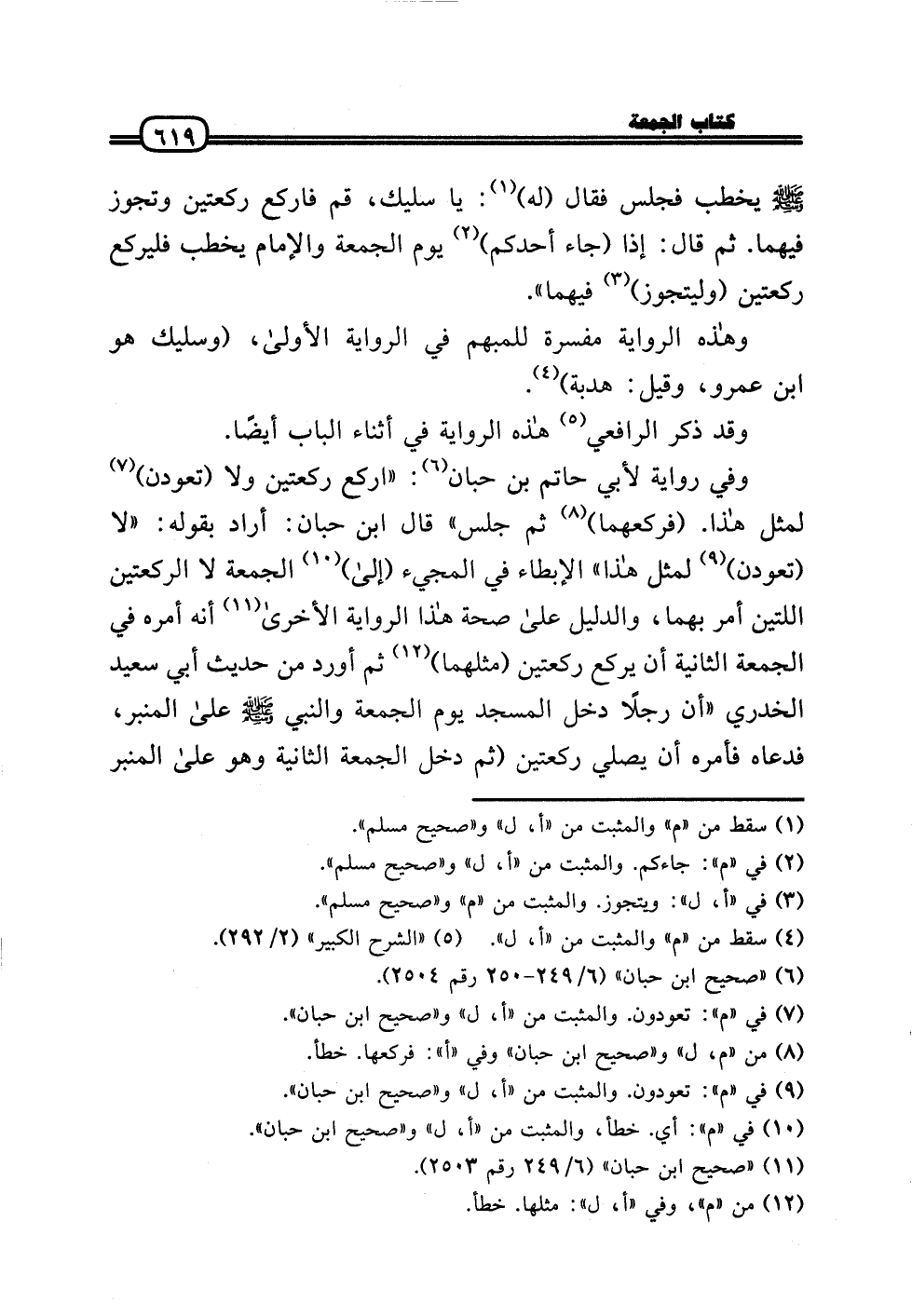 وَفِي رِوَايَة لأبي حَاتِم بن حبَان: «اركع رَكْعَتَيْنِ وَلَا (تعودن) لمثل هَذَا. (فركعهما) ثمَّ جلس» قَالَ ابْن حبَان: أَرَادَ بقوله: «لَا (تعودن) لمثل هَذَا» الإبطاء فِي الْمَجِيء (إِلَى) الْجُمُعَة لَا الرَّكْعَتَيْنِ اللَّتَيْنِ أَمر بهما، وَالدَّلِيل عَلَى صِحَة هَذَا الرِّوَايَة الْأُخْرَى أَنه أمره فِي الْجُمُعَة الثَّانِيَة أَن يرْكَع رَكْعَتَيْنِ (مثلهمَا) ثمَّ أورد من حَدِيث أبي سعيد الْخُدْرِيّ «أَن رجلا دخل الْمَسْجِد يَوْم الْجُمُعَة وَالنَّبِيّ - صَلَّى الله عَلَيْهِ وَسلم - عَلَى الْمِنْبَر، فَدَعَاهُ فَأمره أَن يُصَلِّي رَكْعَتَيْنِ (ثمَّ دخل الْجُمُعَة الثَّانِيَة وَهُوَ عَلَى الْمِنْبَر