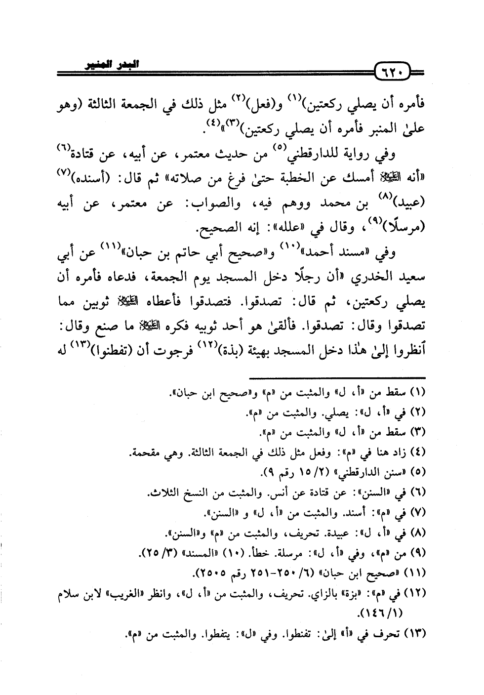 وَفِي رِوَايَة للدارقطني من حَدِيث مُعْتَمر، عَن أَبِيه، عَن قَتَادَة «أَنه عَلَيْهِ السَّلَام أمسك عَن الْخطْبَة حَتَّى فرغ من صلَاته» ثمَّ قَالَ: (أسْندهُ) (عبيد) بن مُحَمَّد وَوهم فِيهِ، وَالصَّوَاب: عَن مُعْتَمر، عَن أَبِيه (مُرْسلا) ، وَقَالَ فِي «علله» : إِنَّه الصَّحِيح.