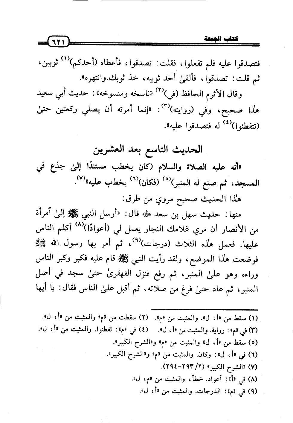 «أَنه عَلَيْهِ الصَّلَاة وَالسَّلَامُ (كَانَ يخْطب مُسْتَندا إِلَى جذع فِي الْمَسْجِد، ثمَّ صنع لَهُ الْمِنْبَر) (فَكَانَ) يخْطب عَلَيْهِ» .