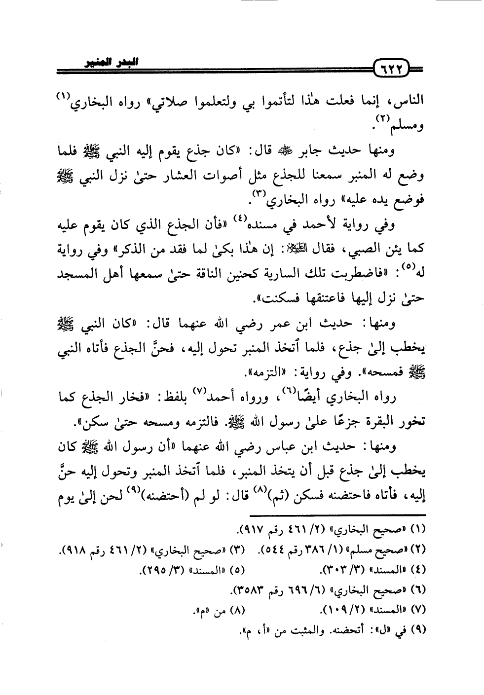 رَوَاهُ البُخَارِيّ أَيْضا، وَرَوَاهُ أَحْمد بِلَفْظ: «فخار الْجذع كَمَا تخور الْبَقَرَة جزعًا عَلَى رَسُول الله - صَلَّى الله عَلَيْهِ وَسلم -. فَالْتَزمهُ ومسحه حَتَّى سكن» .