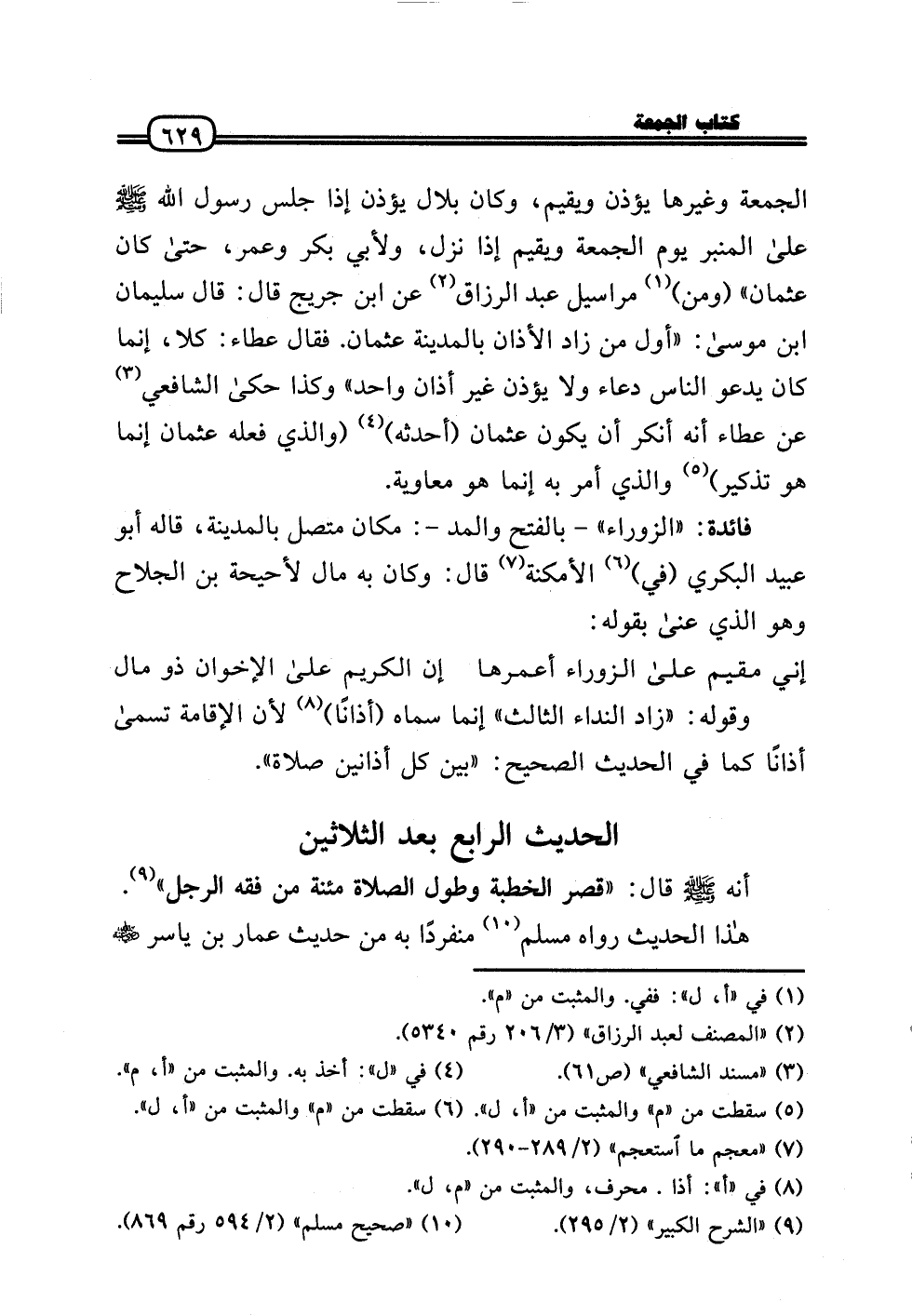الْجُمُعَة وَغَيرهَا يُؤذن وَيُقِيم، وَكَانَ بِلَال يُؤذن إِذا جلس رَسُول الله - صَلَّى الله عَلَيْهِ وَسلم - عَلَى الْمِنْبَر يَوْم الْجُمُعَة وَيُقِيم إِذا نزل، وَلأبي بكر وَعمر، حَتَّى كَانَ عُثْمَان» (وَمن) مَرَاسِيل عبد الرَّزَّاق عَن ابْن جريج قَالَ: قَالَ سُلَيْمَان بن مُوسَى: «أول من زَاد الْأَذَان بِالْمَدِينَةِ عُثْمَان. فَقَالَ عَطاء: كلا، إِنَّمَا كَانَ يَدْعُو النَّاس دُعَاء وَلَا يُؤذن غير أَذَان وَاحِد» وَكَذَا حَكَى الشَّافِعِي عَن عَطاء أَنه أنكر أَن يكون عُثْمَان (أحدثه) (وَالَّذِي فعله عُثْمَان إِنَّمَا هُوَ تذكير) وَالَّذِي أَمر بِهِ إِنَّمَا هُوَ مُعَاوِيَة.