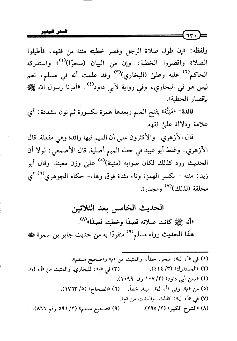 وَلَفظه: «إِن طول صَلَاة الرجل وَقصر خطبَته مئنة من فقهه، فأطيلوا الصَّلَاة واقصروا الْخطْبَة، وَإِن من الْبَيَان (سحرًا) » واستدركه الْحَاكِم عَلَيْهِ وَعَلَى (البُخَارِيّ) وَقد علمت أَنه فِي مُسلم، نعم لَيْسَ هُوَ فِي البُخَارِيّ، وَفِي رِوَايَة لأبي دَاوُد: «أمرنَا رَسُول الله - صَلَّى الله عَلَيْهِ وَسلم - بِإِقْصَارِ الْخطْبَة» .