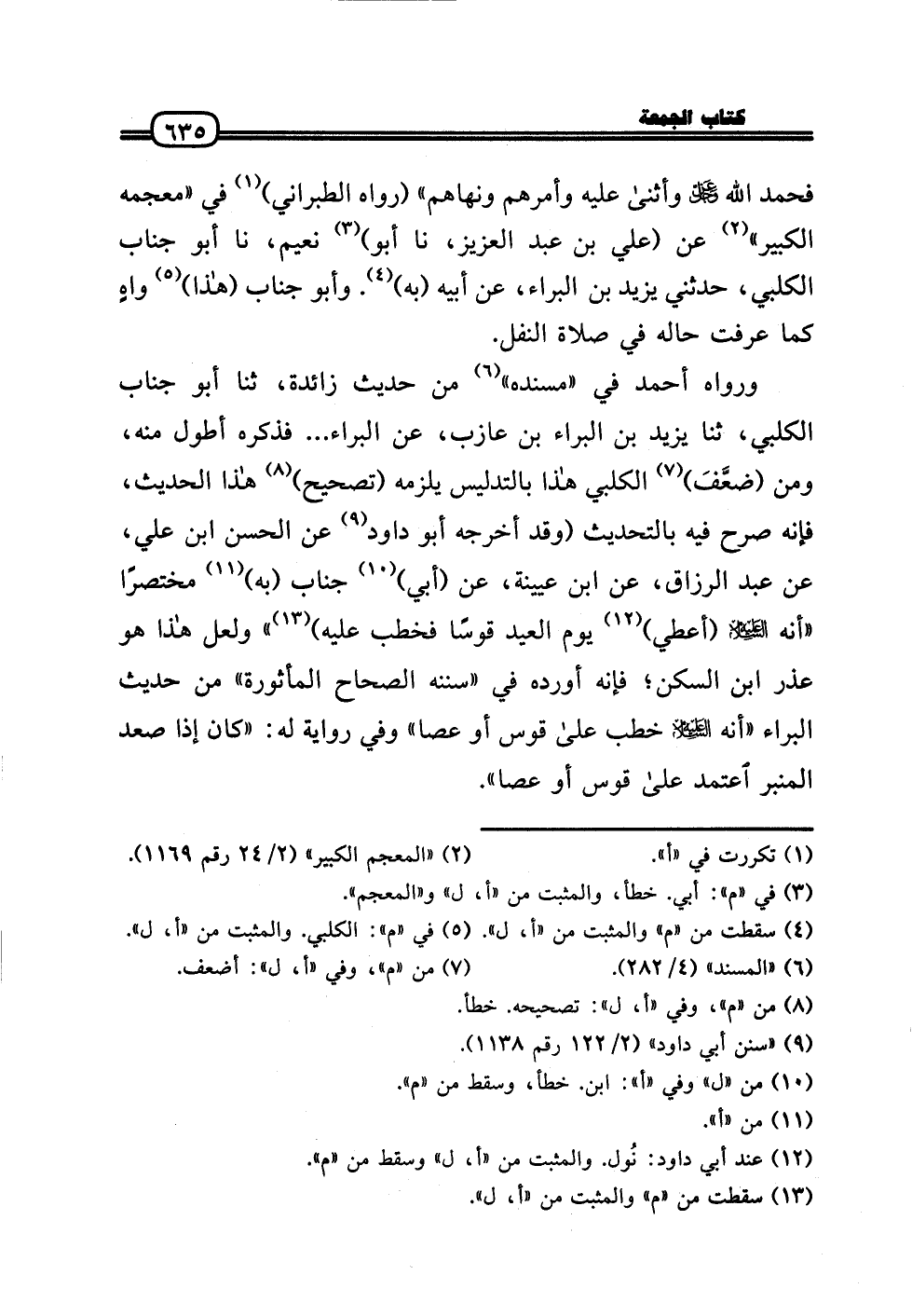 فَحَمدَ الله عَزَّ وَجَلَّ وَأَثْنَى عَلَيْهِ وَأمرهمْ ونهاهم» (رَوَاهُ الطَّبَرَانِيّ) فِي «مُعْجَمه الْكَبِير» عَن (عَلّي بن عبد الْعَزِيز، نَا أَبُو) نعيم، نَا أَبُو جناب الْكَلْبِيّ، حَدثنِي يزِيد بن الْبَراء، عَن أَبِيه (بِهِ) . وَأَبُو جناب (هَذَا) واهٍ كَمَا عرفت حَاله فِي صَلَاة النَّفْل.