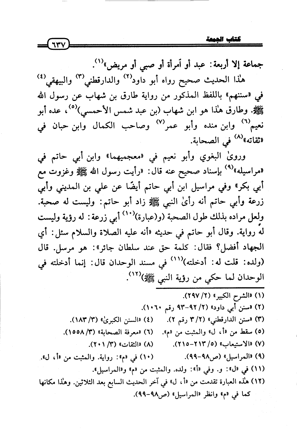 هَذَا الحَدِيث صَحِيح رَوَاهُ أَبُو دَاوُد وَالدَّارَقُطْنِيّ وَالْبَيْهَقِيّ فِي «سُنَنهمْ» بِاللَّفْظِ الْمَذْكُور من رِوَايَة طَارق بن شهَاب عَن رَسُول الله - صَلَّى الله عَلَيْهِ وَسلم -. وطارق هَذَا هُوَ ابْن شهَاب (بن عبد شمس الأحمسي) ، عده أَبُو نعيم وَابْن مَنْدَه وَأَبُو عمر وَصَاحب الْكَمَال وَابْن حبَان فِي «ثقاته» فِي الصَّحَابَة.