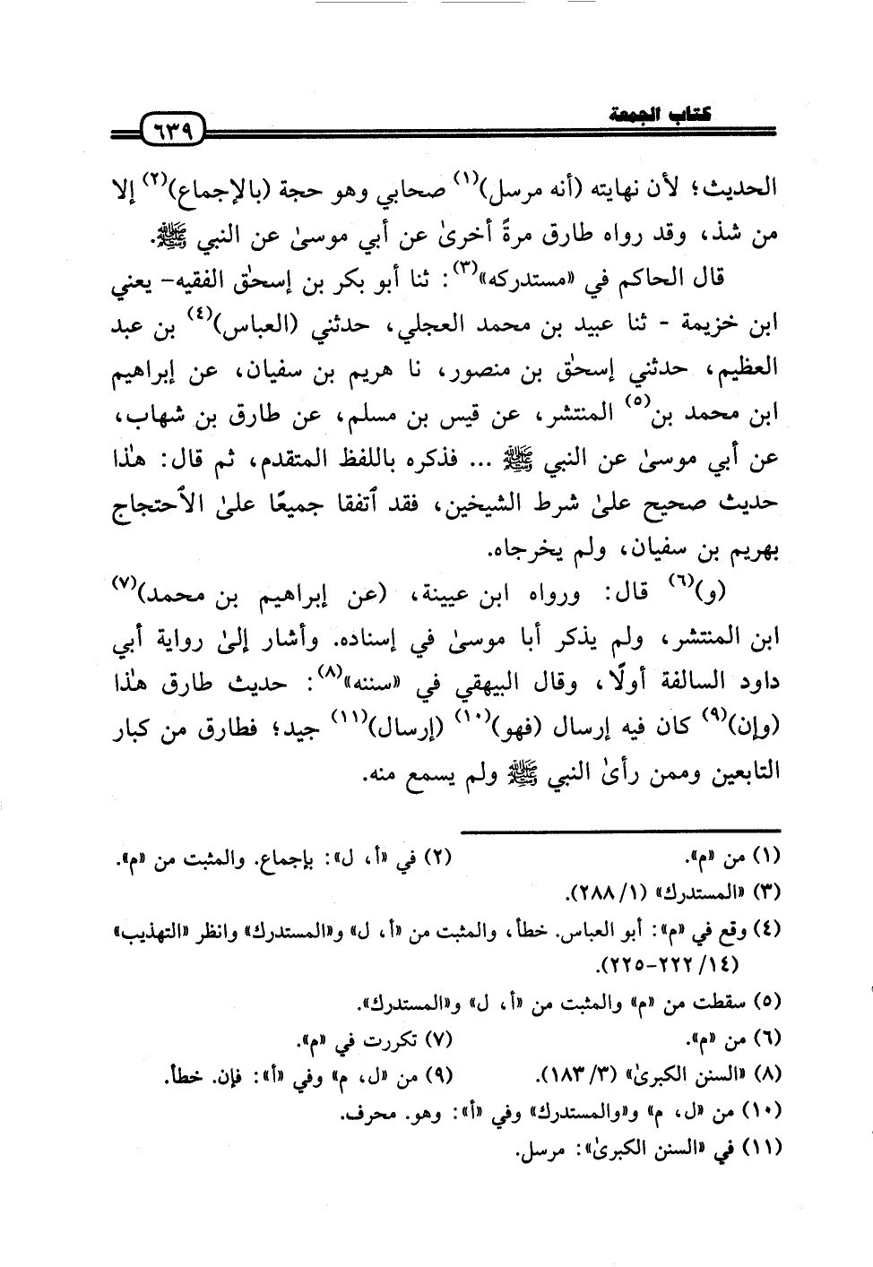 الحَدِيث؛ لِأَن نهايته (أَنه مُرْسل) صَحَابِيّ وَهُوَ حجَّة (بِالْإِجْمَاع) إِلَّا من شَذَّ، وَقد رَوَاهُ طَارق مرّة أُخْرَى عَن أبي مُوسَى عَن النَّبِي - صَلَّى الله عَلَيْهِ وَسلم -.