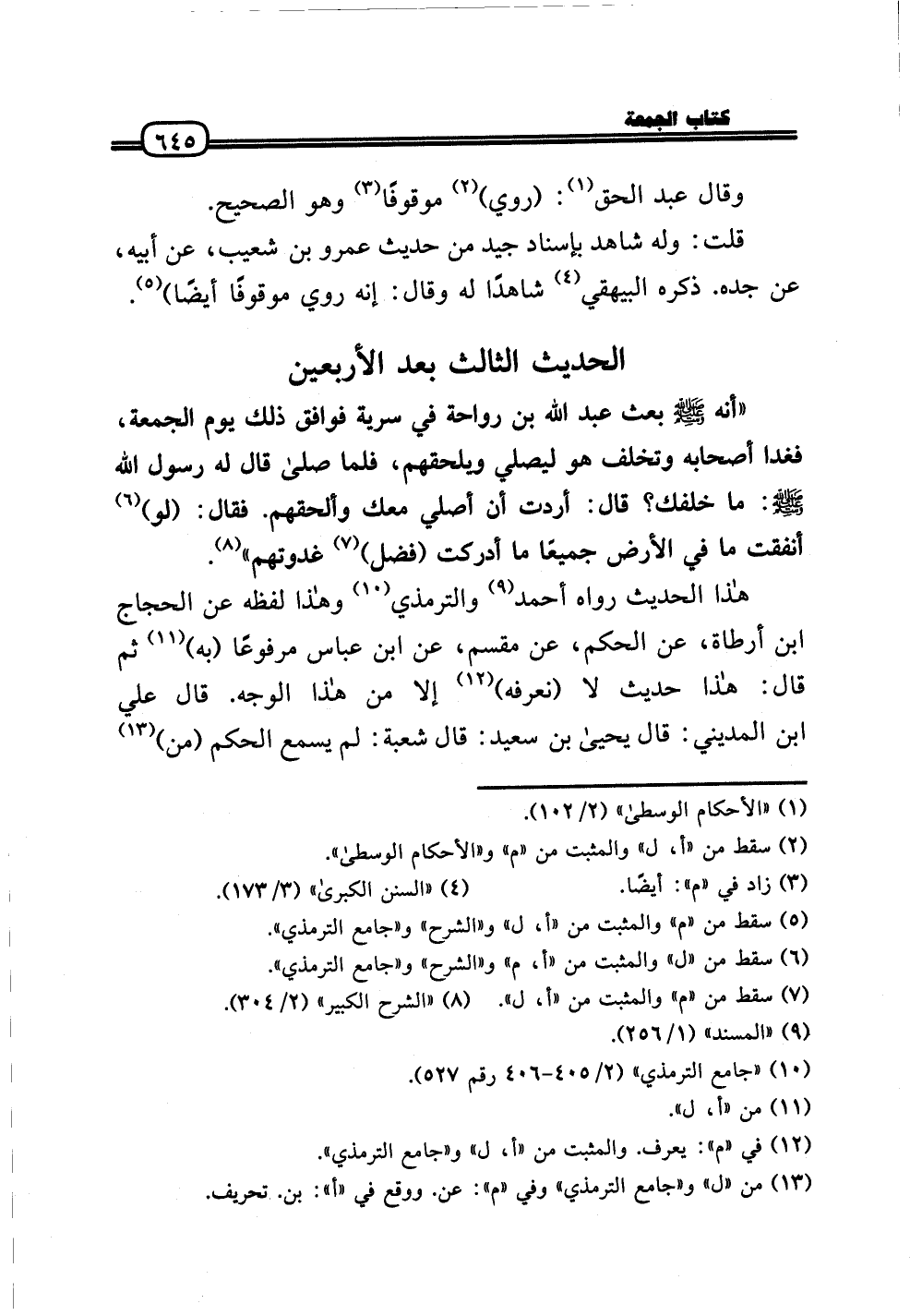 «أنَّه - صَلَّى الله عَلَيْهِ وَسلم - بعث عبد الله بن رَوَاحَة فِي سَرِيَّة فَوَافَقَ ذَلِك يَوْم الْجُمُعَة، فغدا أَصْحَابه وتخلف هُوَ ليُصَلِّي ويلحقهم، فَلَمَّا صَلَّى قَالَ لَهُ رَسُول الله - صَلَّى الله عَلَيْهِ وَسلم -: مَا خَلفك؟ قَالَ: أردْت أَن أُصَلِّي مَعَك وألحقهم. فَقَالَ: (لَو) أنفقت مَا فِي الأَرْض جَمِيعًا مَا أدْركْت (فضل) غدوتهم» .