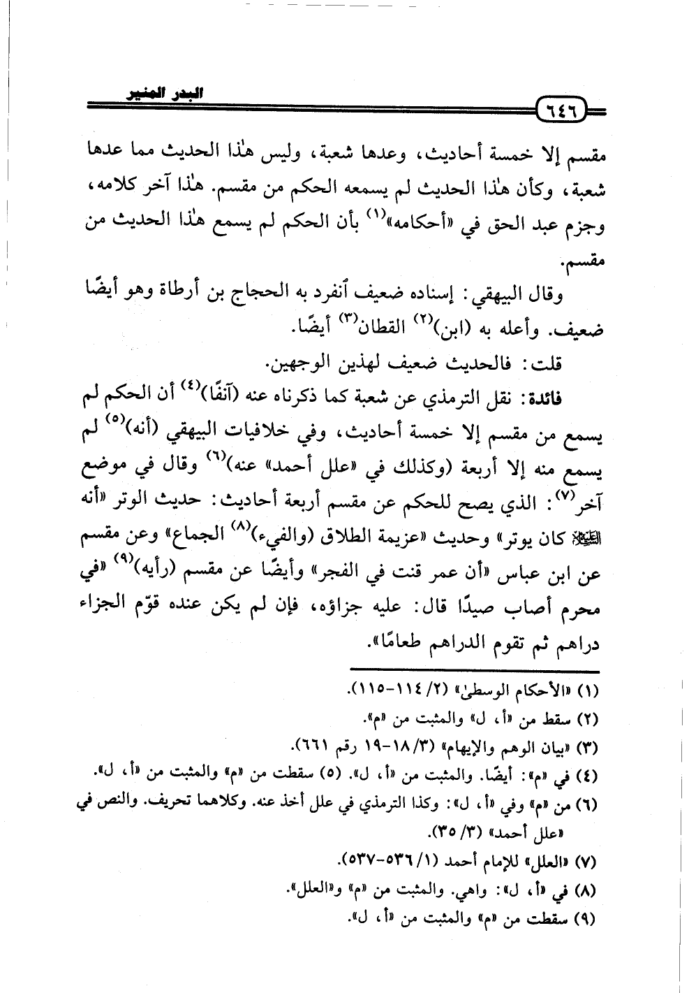 فَائِدَة: نقل التِّرْمِذِيّ عَن شُعْبَة كَمَا ذَكرْنَاهُ عَنهُ (آنِفا) أَن الحكم لم يسمع من مقسم إِلَّا خَمْسَة أَحَادِيث، وَفِي خلافيات الْبَيْهَقِيّ (أَنه) لم يسمع مِنْهُ إِلَّا أَرْبَعَة (وَكَذَلِكَ فِي «علل أَحْمد» عَنهُ) وَقَالَ فِي مَوضِع آخر: الَّذِي يَصح للْحكم عَن مقسم أَرْبَعَة أَحَادِيث: حَدِيث الْوتر «أَنه عَلَيْهِ السَّلَام كَانَ يُوتر» وَحَدِيث «عَزِيمَة الطَّلَاق (والفيء) الْجِمَاع» وَعَن مقسم عَن ابْن عَبَّاس «أَن عمر قنت فِي الْفجْر» وَأَيْضًا عَن مقسم (رَأْيه) «فِي محرم أصَاب صيدا قَالَ: عَلَيْهِ جَزَاؤُهُ، فَإِن لم يكن عِنْده قوّم الْجَزَاء دَرَاهِم ثمَّ تقوم الدَّرَاهِم طَعَاما» .